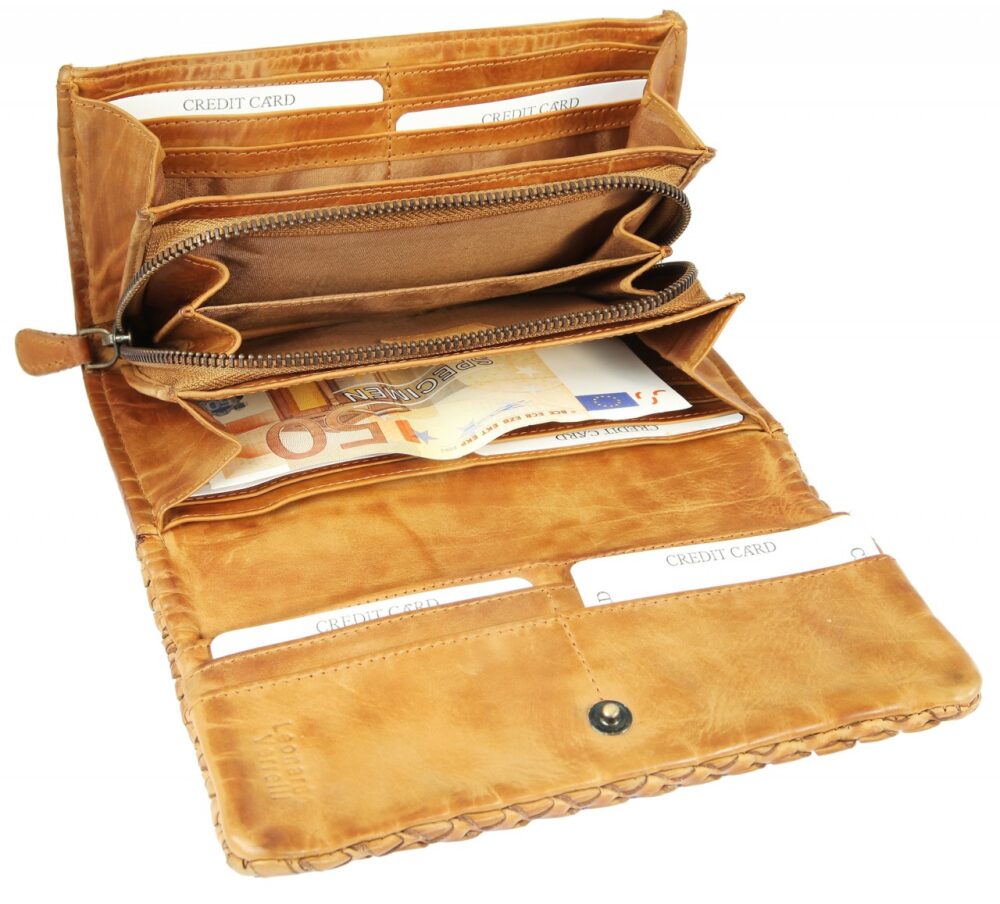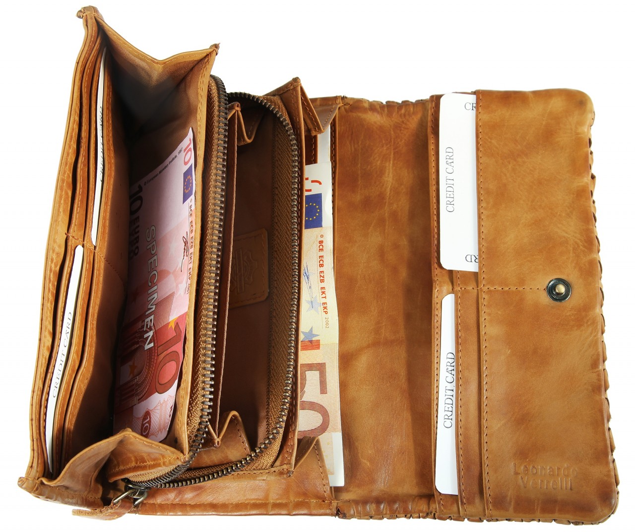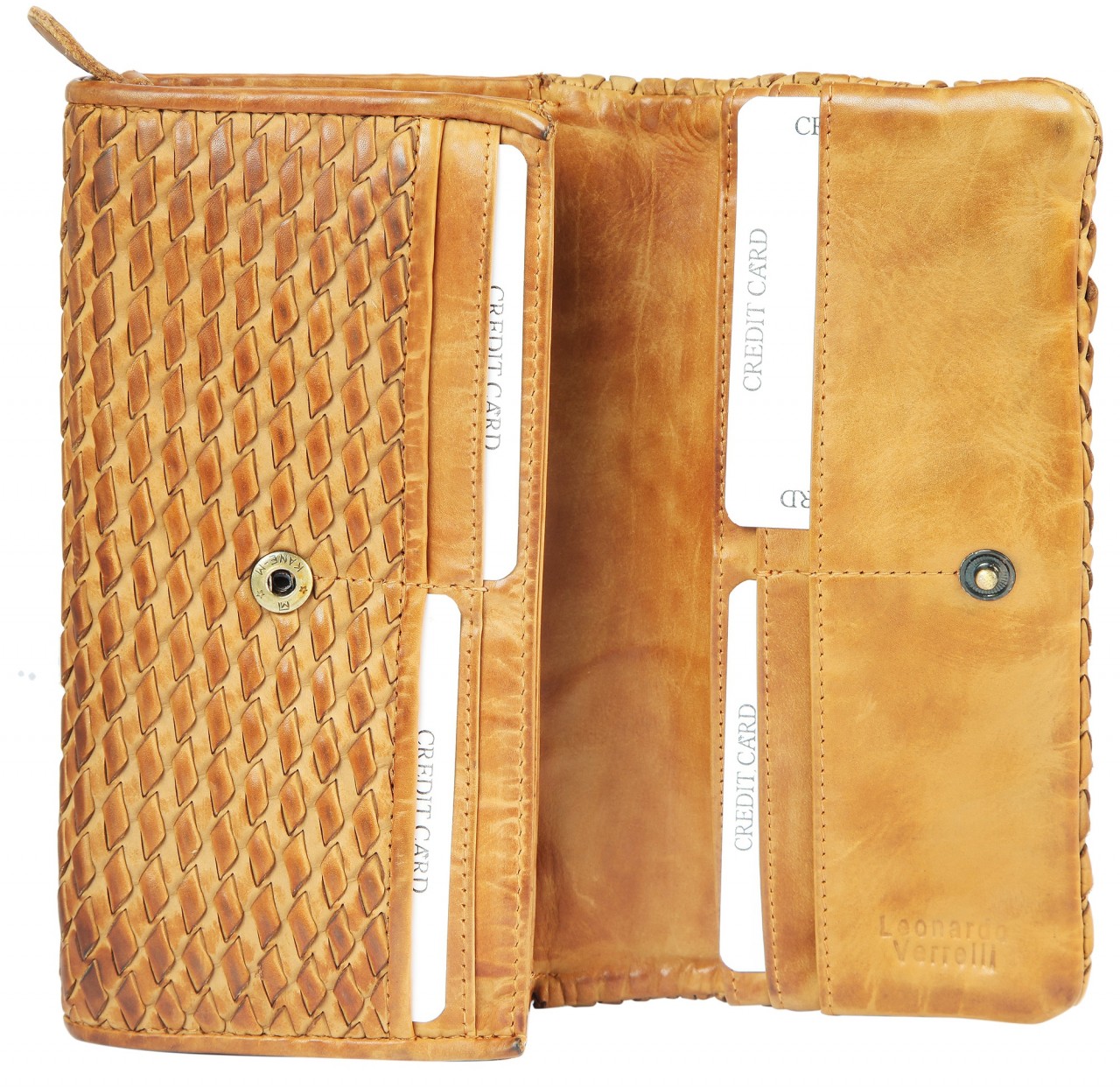 A carteira feminina da marca Leonardo Verrelli é confecionada em formato paisagem em couro genuíno com efeito lavado e tem visual tecido disposto na diagonal. A sensação do couro é particularmente macia e distinta. O design deu muita ênfase à individualidade, de modo que esta bolsa não é apenas uma ajudante prática do dia a dia, mas também uma companheira de moda. A carteira é um verdadeiro milagre de espaço e oferece muito espaço de armazenamento para todos os documentos importantes. Dessa forma, você pode manter todos os seus objetos de valor seguros e organizados enquanto estiver em trânsito e ter uma boa visão geral de todos os seus papéis. A carteira está dividida em 20 compartimentos para cartões de crédito, 2 compartimentos para notas e 3 bolsos. O troco pode ser guardado em um compartimento separado para moedas, que pode ser fechado com um fecho.