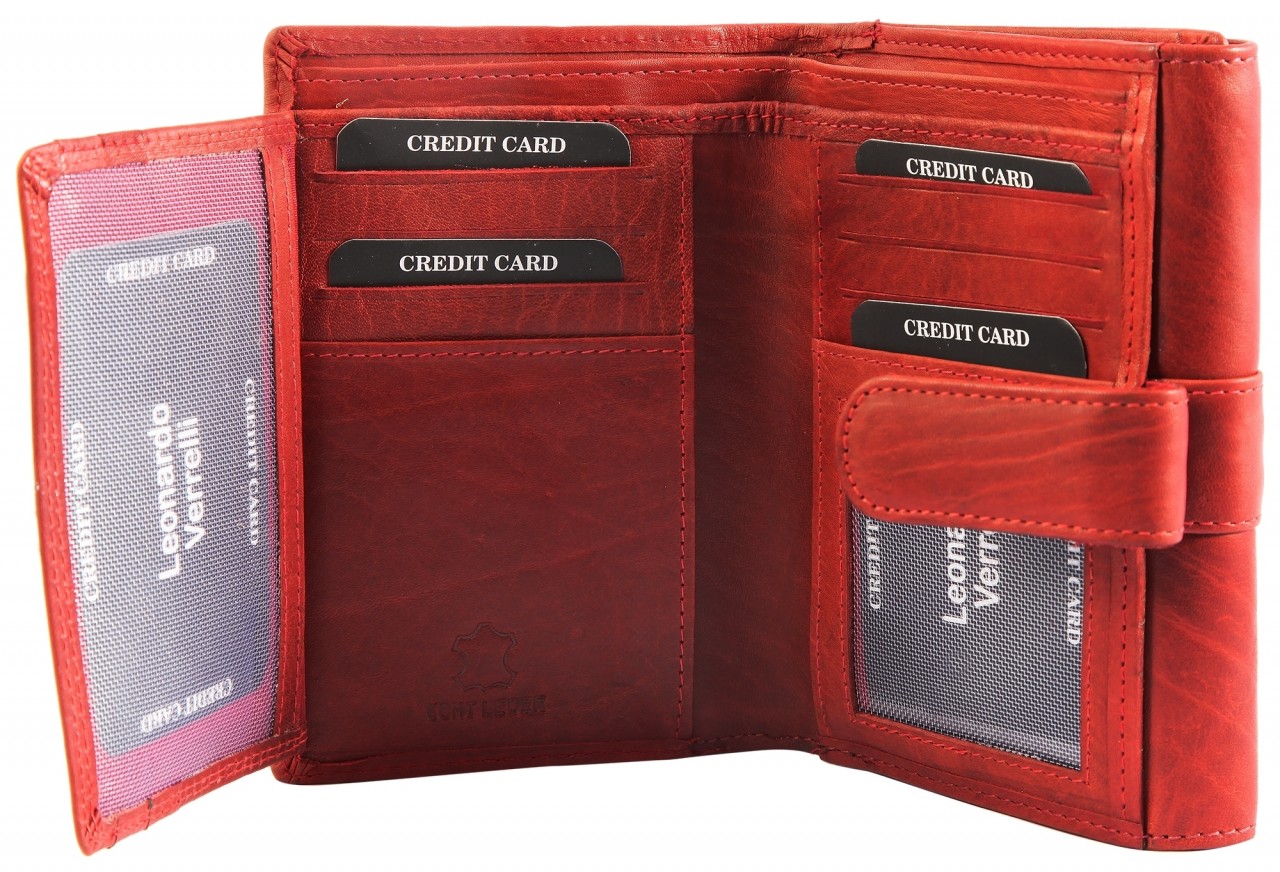 A carteira feminina da Leonardo Verrelli é feita de couro bovino genuíno e tem um visual vintage moderno. O forro interno é confeccionado em material sintético. A costura externa e interna da carteira garante boa durabilidade e estabilidade. A carteira está dividida em 11 compartimentos para cartões de crédito, 2 compartimentos para notas, 2 compartimentos para moedas com fichas de compras, 1 compartimento para moedas com fecho de correr, 2 bolsos deslizantes e 1 compartimento transparente para identificação. A carteira fecha com um prático fecho de pressão no exterior.