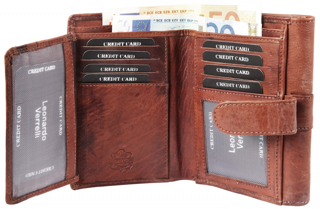 A carteira feminina da Leonardo Verrelli é feita de couro bovino genuíno e tem um visual vintage moderno. O forro interno é confeccionado em material sintético. A costura externa e interna da carteira garante boa durabilidade e estabilidade.A carteira está dividida em 11 compartimentos para cartões de crédito, 2 compartimentos para notas, 2 compartimentos para moedas com fichas de compras, 1 compartimento para moedas com fecho de correr, 2 bolsos deslizantes e 1 compartimento transparente para identificação. A carteira fecha com um prático fecho de pressão no exterior.