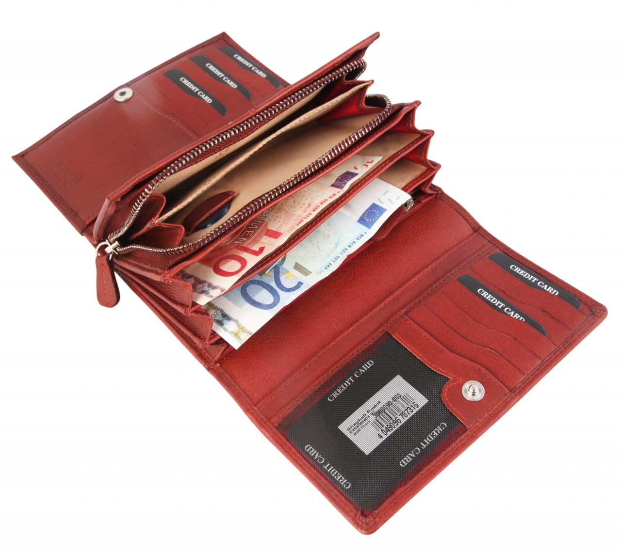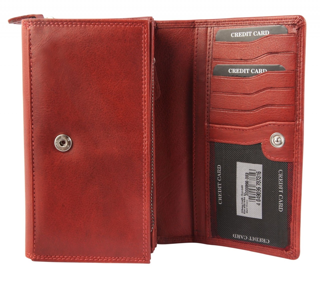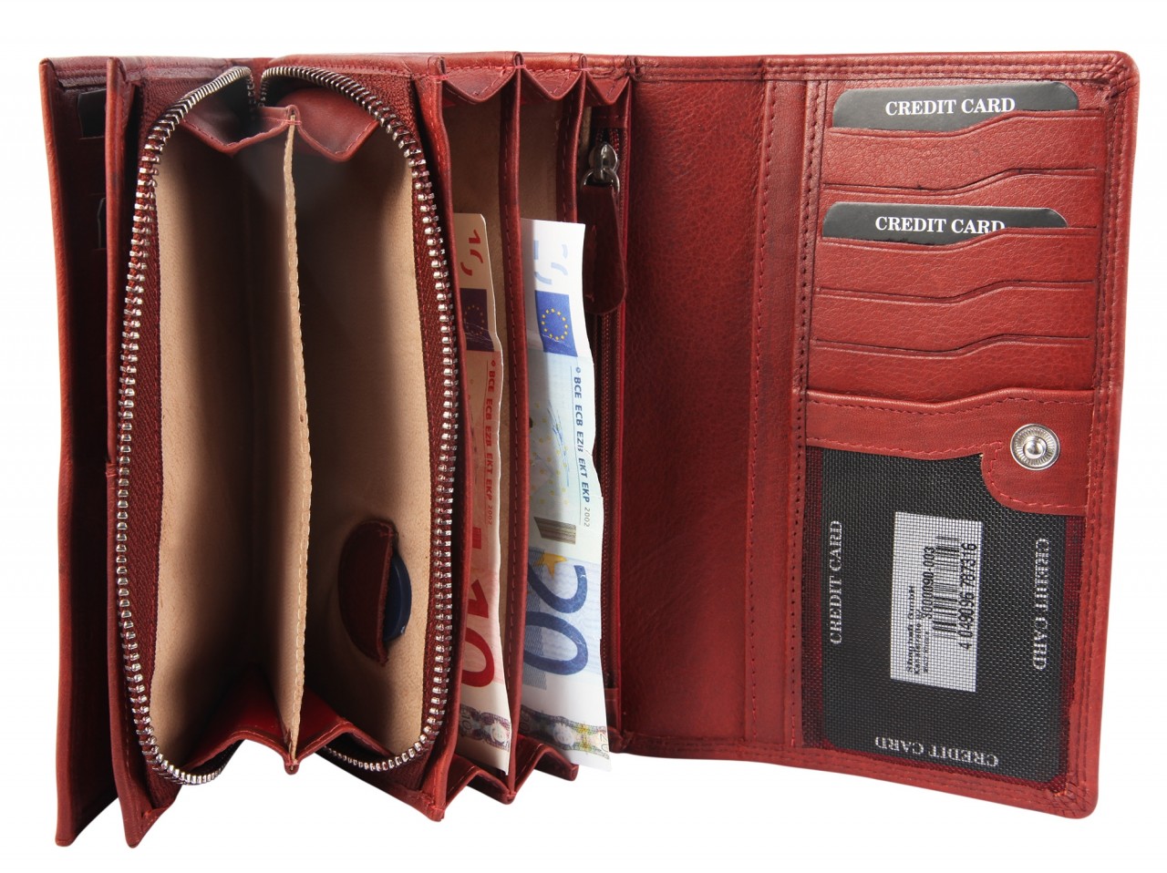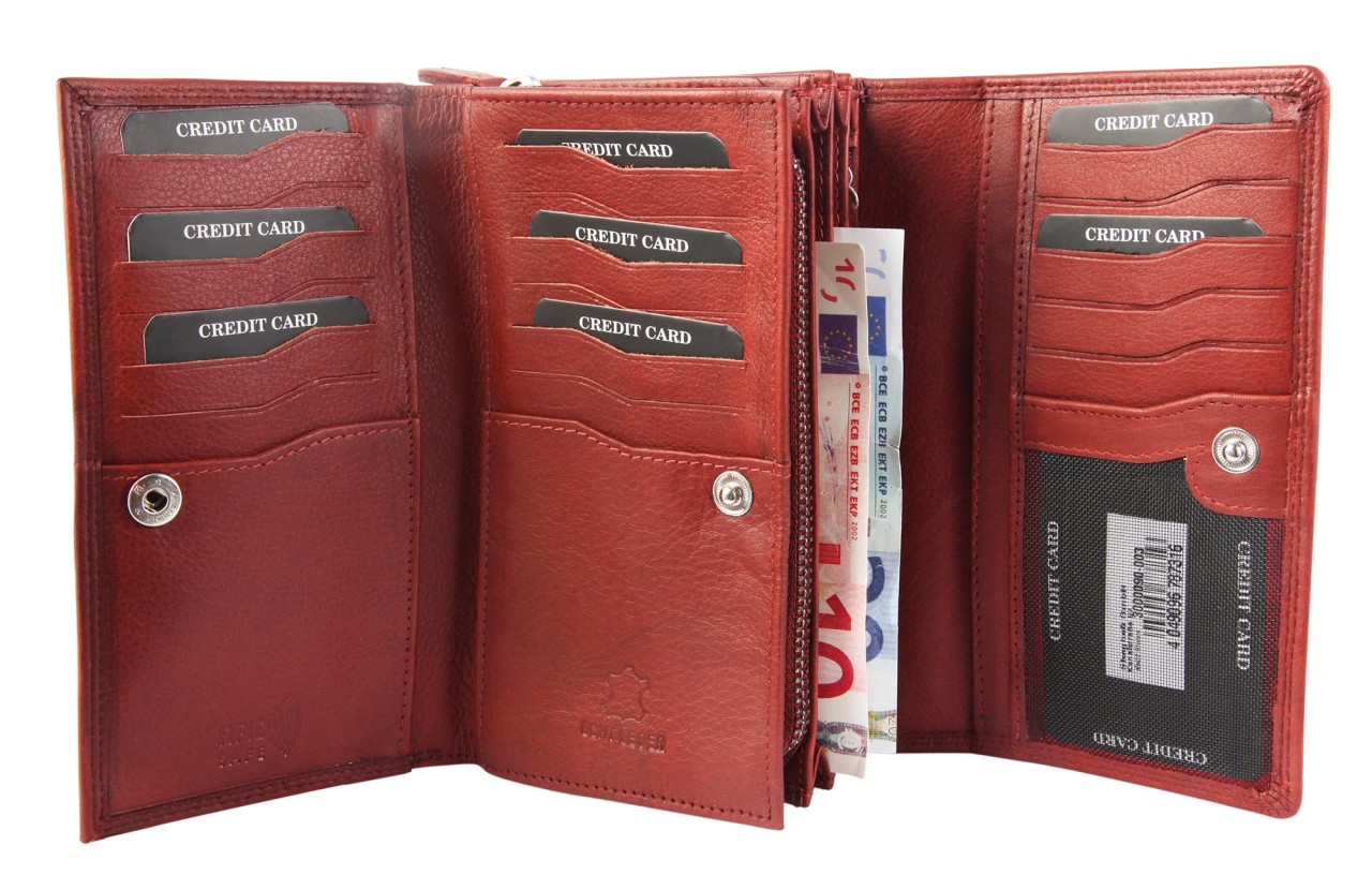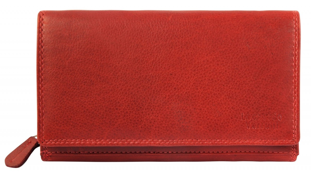 A carteira feminina em formato paisagem da marca Leonardo Verrelli é confeccionada em couro bovino genuíno. O forro interno também é feito principalmente de couro, parte dele é feito de tecido. A costura dupla na parte externa e interna da carteira garante boa durabilidade e estabilidade. A carteira oferece muito espaço de armazenamento para todos os documentos importantes. A carteira está dividida em 18 compartimentos para cartões de crédito, 3 compartimentos para notas, 1 compartimento para moedas com fecho e 7 bolsos deslizantes.