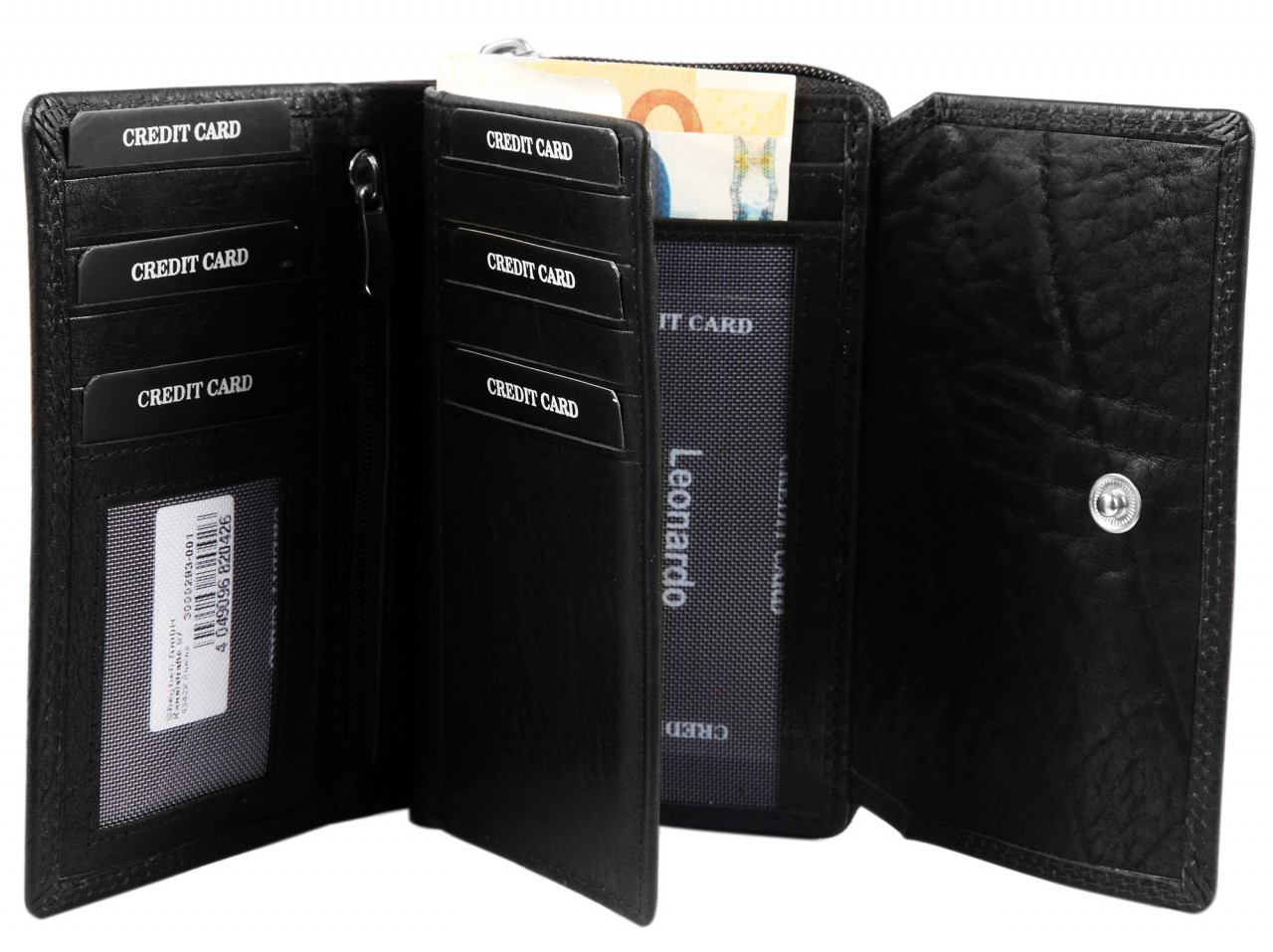 A carteira feminina em formato paisagem da marca Leonardo Verrelli é confeccionada em couro bovino genuíno e tem visual crocante. O forro interno é feito principalmente de material sintético. A costura dupla na parte externa e interna da carteira garante boa durabilidade e estabilidade.  A carteira está dividida em 10 compartimentos para cartões de crédito, 2 compartimentos para notas, 4 compartimentos para moedas com fichas de compras, 1 compartimento para moedas com fecho, 1 compartimento com fecho na zona interior, 3 compartimentos transparentes para identificação e 2 bolsos deslizantes. A carteira fecha com um prático fecho de pressão no exterior, o compartimento para moedas fecha com fecho.
