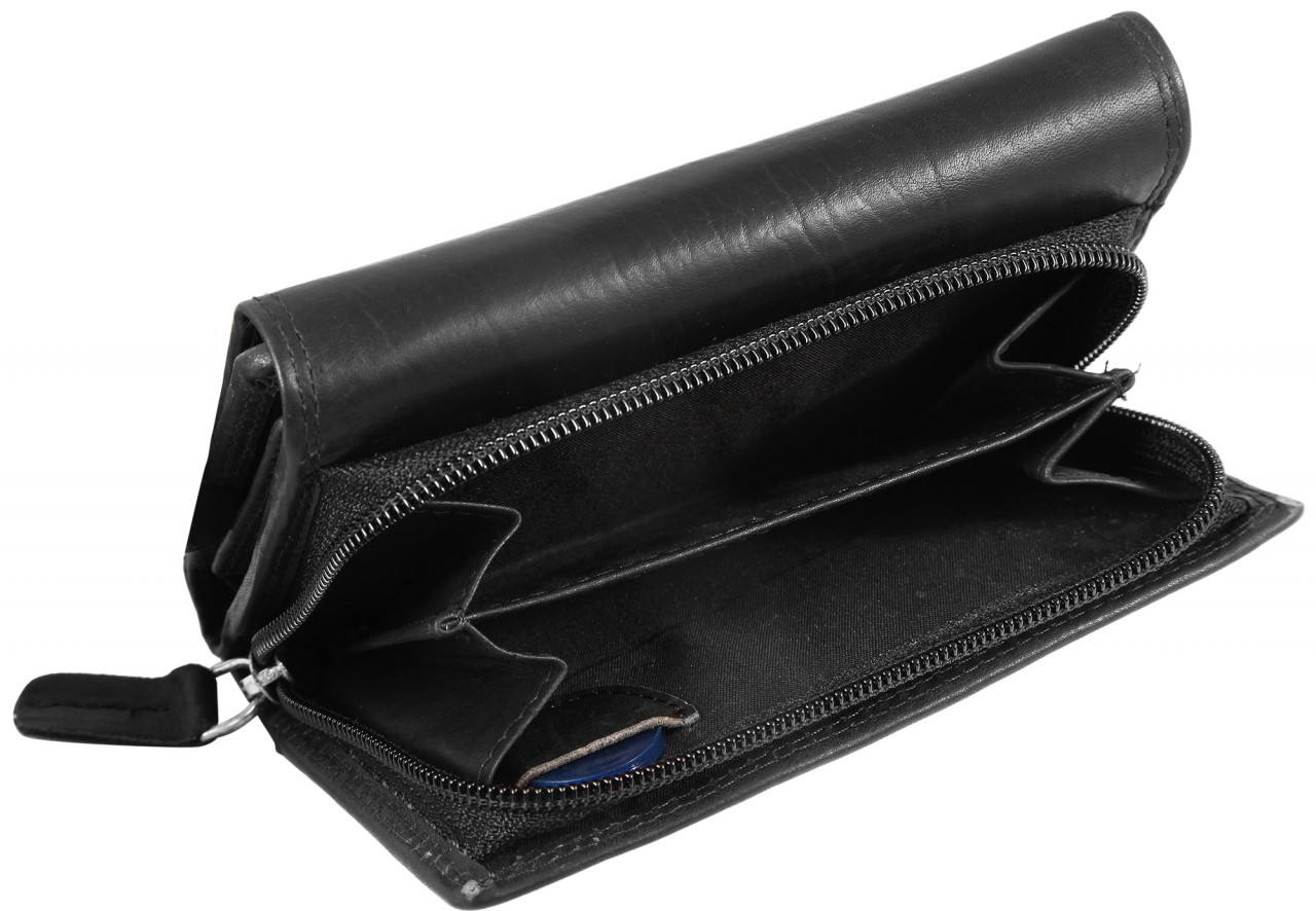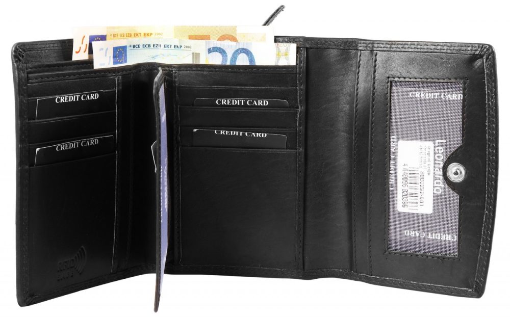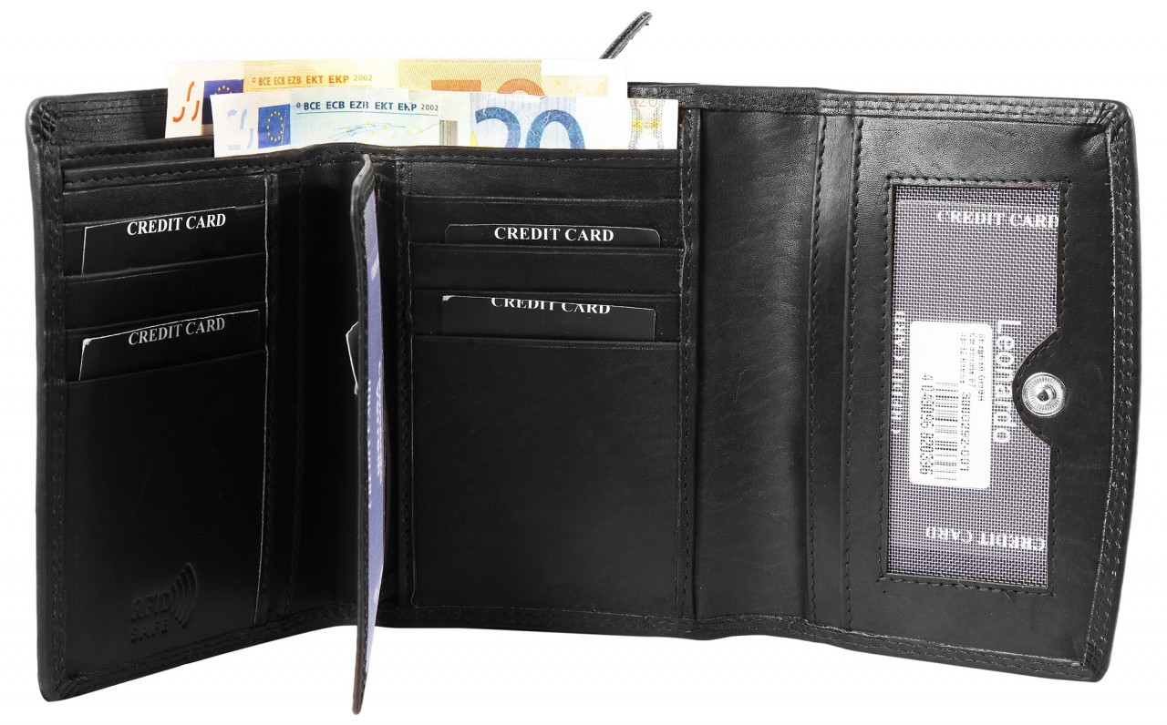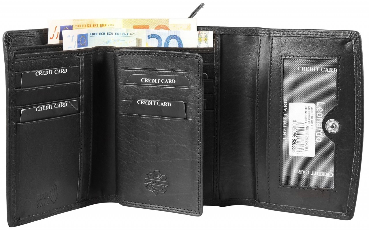 A carteira feminina em formato paisagem da marca Leonardo Verrelli é confeccionada em couro bovino genuíno. A costura dupla na parte externa e interna da carteira garante boa durabilidade e estabilidade. A carteira oferece muito espaço de armazenamento para todos os documentos importantes. A Está dividido em 12 compartimentos para cartões de crédito, 2 compartimentos para notas, 2 compartimentos para moedas com fecho e chip de compras, 2 compartimentos transparentes para identificação e 4 bolsos deslizantes. A carteira fecha com um prático fecho de pressão no exterior.