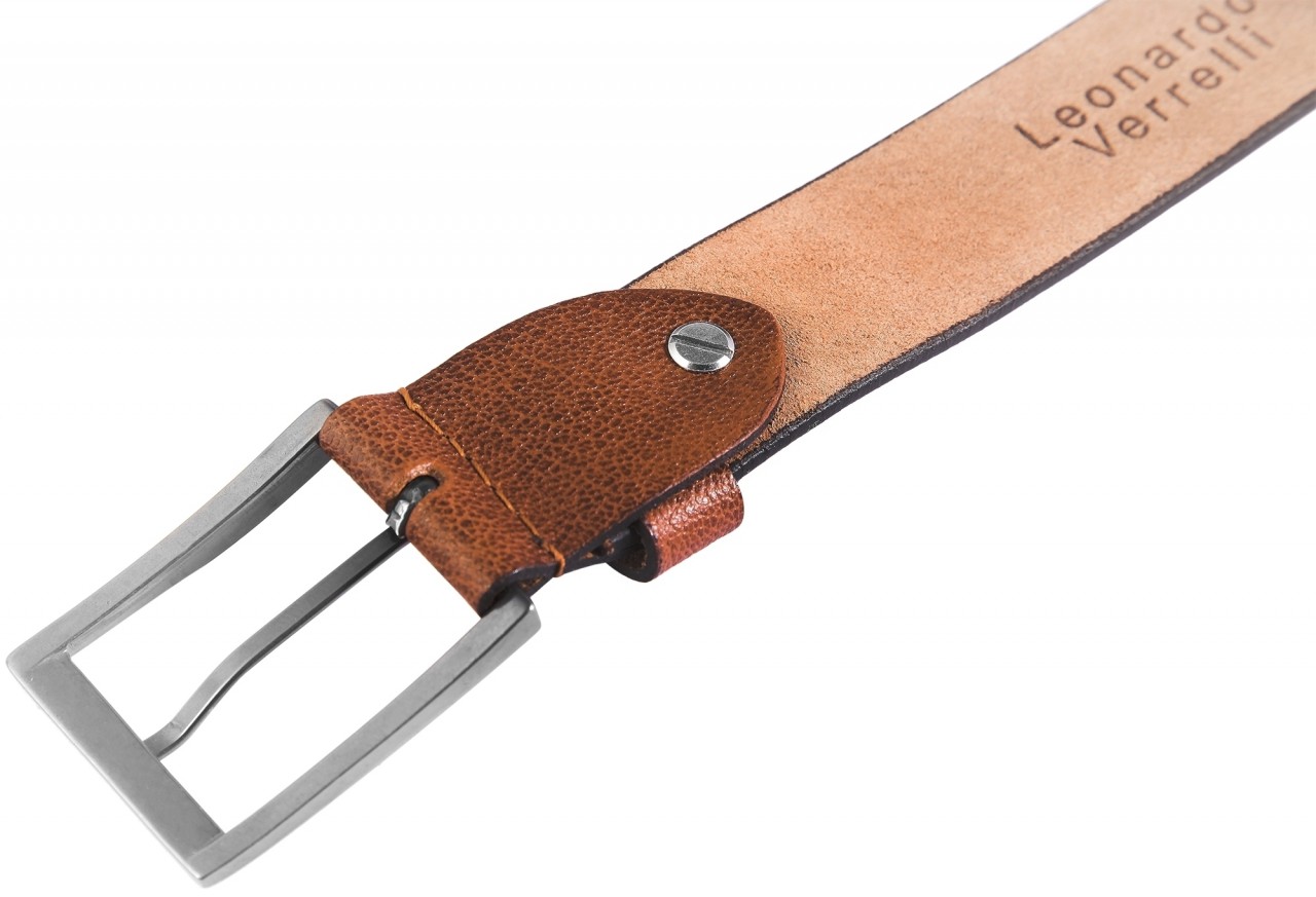 O cinto masculino castanho claro da marca Leonardo Verrelli é feito de couro genuíno e tem uma superfície lisa com granulação sutil. O cinto tem 3,3 cm de largura e 3 mm de espessura. Está disponível em tamanhos de cintura de 90 cm a 140 cm. O cinto tem uma fivela de metal prateada costurada à mão. Os furos para o mandril estão espaçados de 2,0 cm. Uma característica especial é que o cinto pode ser encurtado para qualquer comprimento. Para fazer isso, use uma chave de fenda para afrouxar um parafuso em baixo da fivela do pino e simplesmente ajuste o cinto no comprimento desejado. O couro robusto do cinto masculino torna-o particularmente resistente e, portanto, um companheiro fiel que pode ser usado em inúmeras ocasiões.