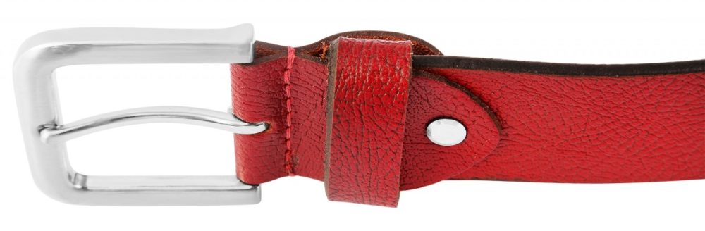 O cinto vermelho escuro de Leonardo Verrelli é feito de couro genuíno de búfalo e tem uma superfície levemente granulada.