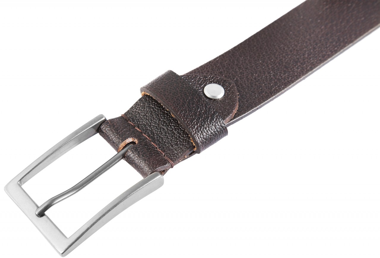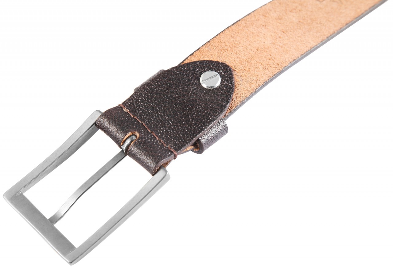 O cinto masculino marrom escuro da Leonardo Verrelli é feito de couro genuíno e tem uma superfície lisa com cicatrizes sutis. O cinto tem 3,3 cm de largura e 3 mm de espessura. Está disponível em tamanhos de cintura de 90 cm a 140 cm.