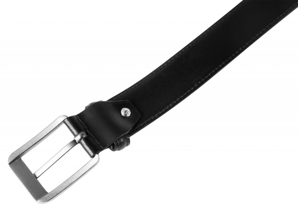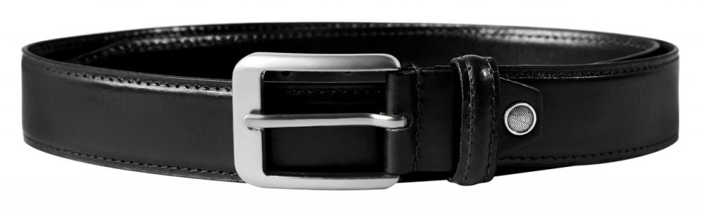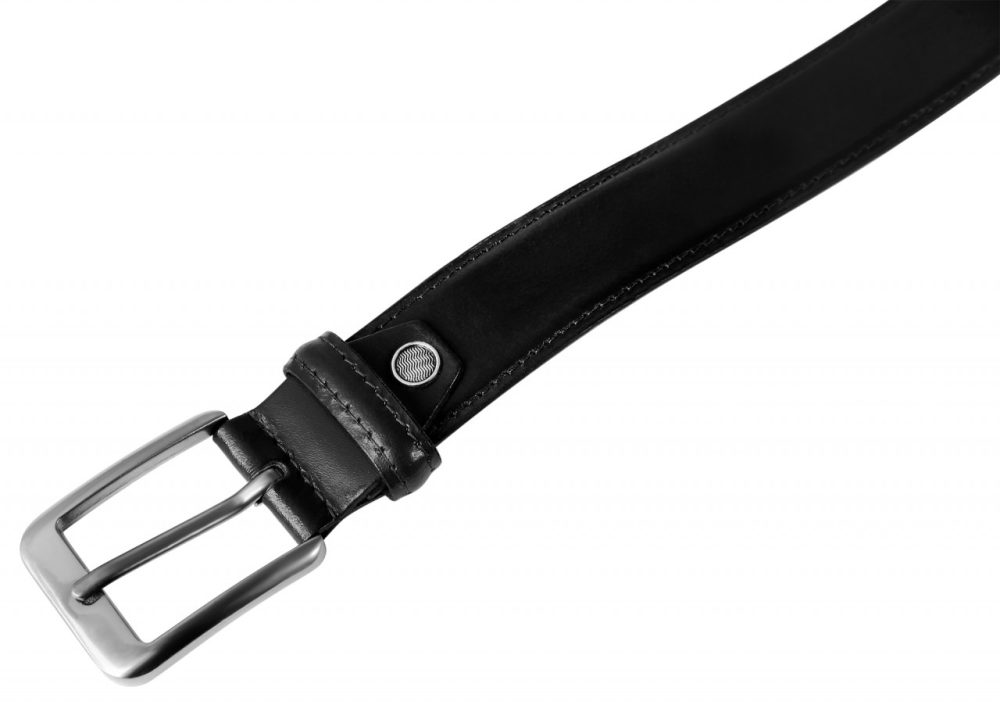 Tem 3,8 cm de largura e 0,3 mm de espessura. O cinto tem uma fivela de metal prateada costurada à mão.