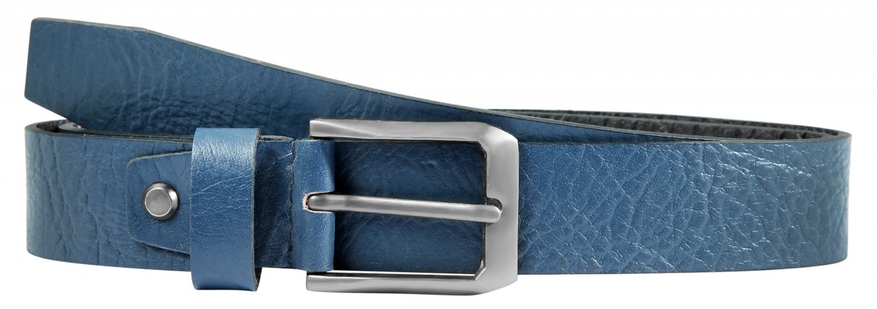O cinto azul de Leonardo Verrelli é feito de couro genuíno e possui acabamento liso com granulação individual. Está disponível em diversos tamanhos de cintura, tem 3,4 cm de largura e 0,4 cm de espessura.