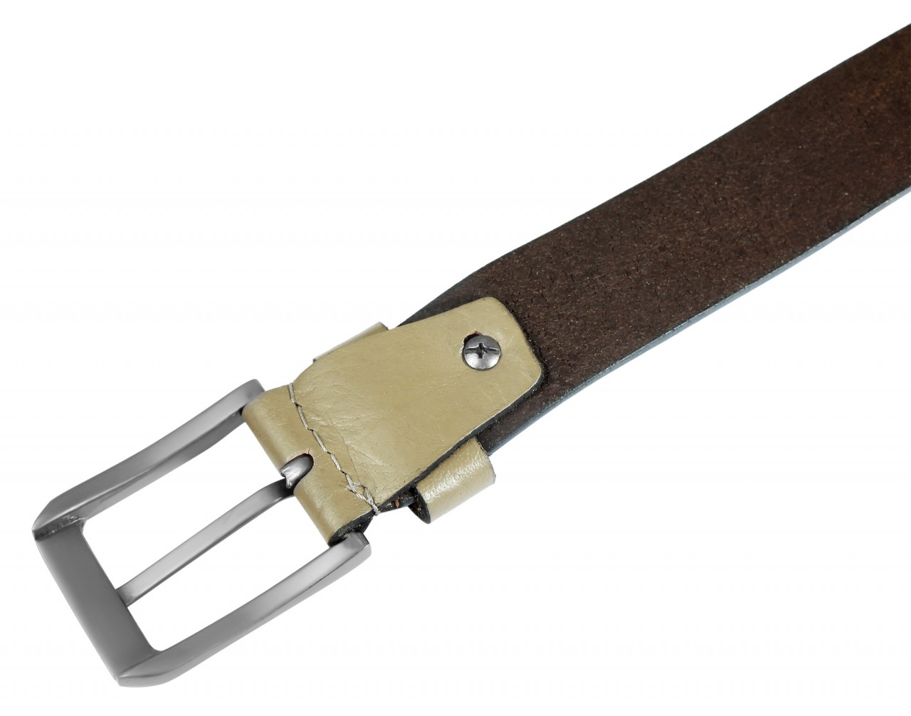 Tem 3,4 cm de largura e 0,4 mm de espessura. O cinto tem uma fivela de metal prateada costurada à mão.