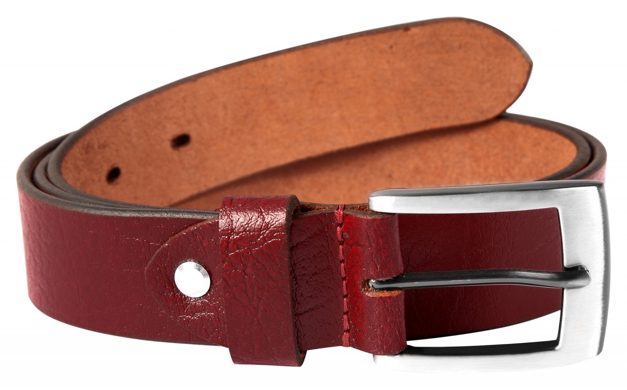 O cinto vermelho escuro de Leonardo Verrelli é feito de couro genuíno de búfalo e tem uma superfície levemente granulada.
