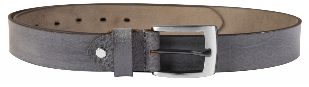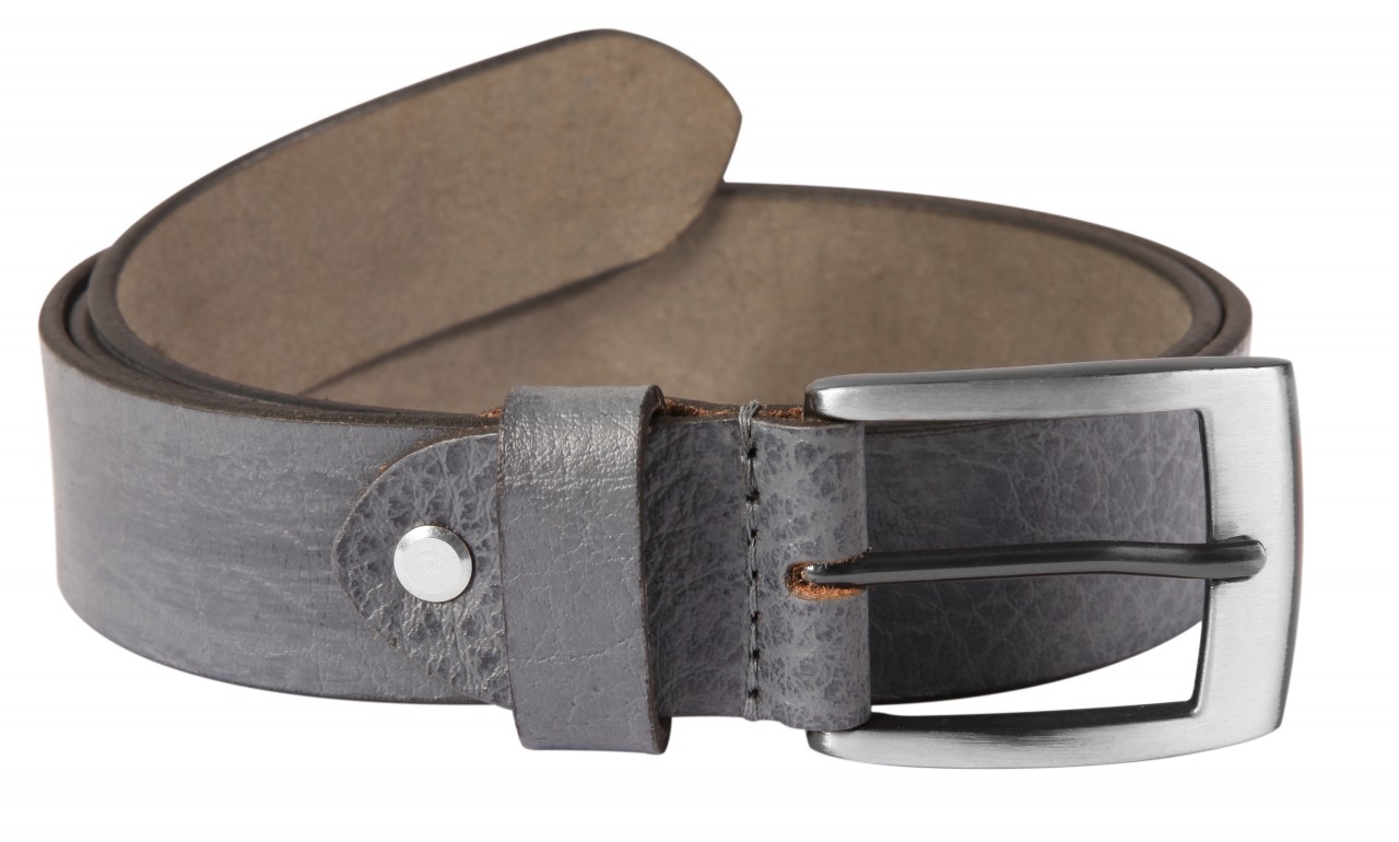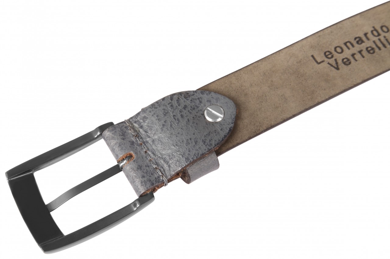 O cinto cinza de Leonardo Verrelli é feito de couro genuíno de búfalo e tem uma superfície levemente granulada. O cinto tem 3,3 cm de largura e, portanto, é versátil porque pode ser facilmente puxado pelas presilhas convencionais. A espessura é de 0,4 cm e o cinto de couro está disponível em diversos tamanhos de cintura. O cinto tem uma fivela de metal costurada à mão.