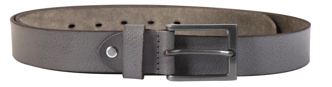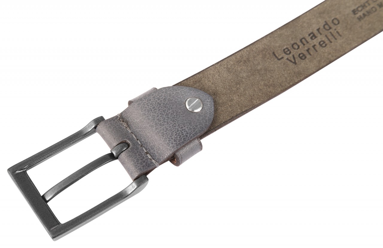 O cinto cinza de Leonardo Verrelli é feito de couro genuíno de búfalo e tem uma superfície levemente granulada.
