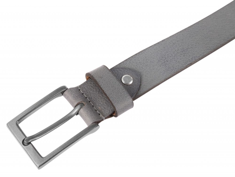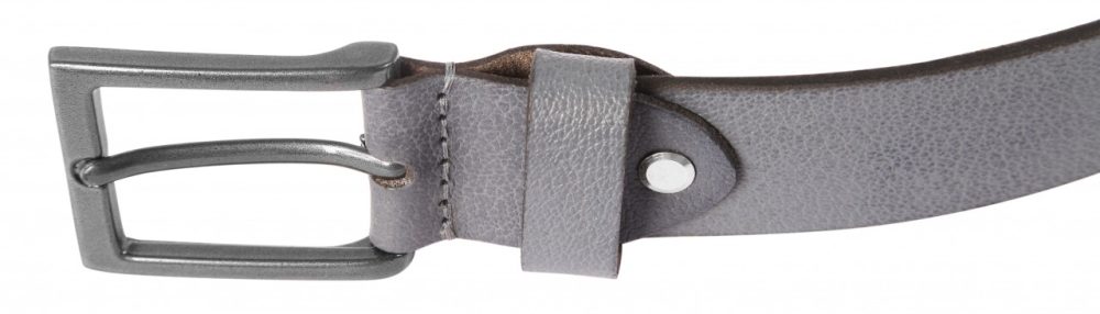 O cinto cinza de Leonardo Verrelli é feito de couro genuíno de búfalo e tem uma superfície levemente granulada.