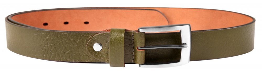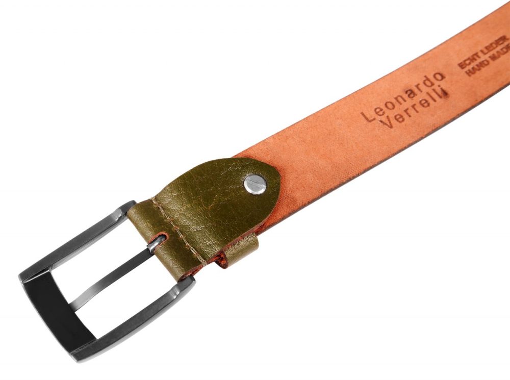 O cinto verde escuro de Leonardo Verrelli é feito de couro genuíno de búfalo e tem uma superfície levemente granulada. O cinto tem 3,3 cm de largura e, portanto, é versátil porque pode ser facilmente puxado pelas presilhas convencionais. A espessura é de 0,3 cm e o cinto de couro está disponível em diversos tamanhos de cintura. O cinto tem uma fivela de metal costurada à mão.
