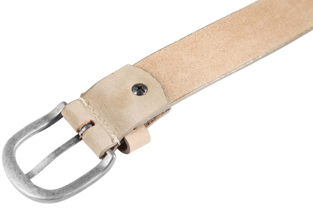 Tem 3,4 cm de largura e 0,4 mm de espessura. O cinto tem uma fivela de metal prateada costurada à mão.
