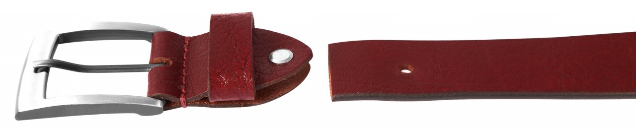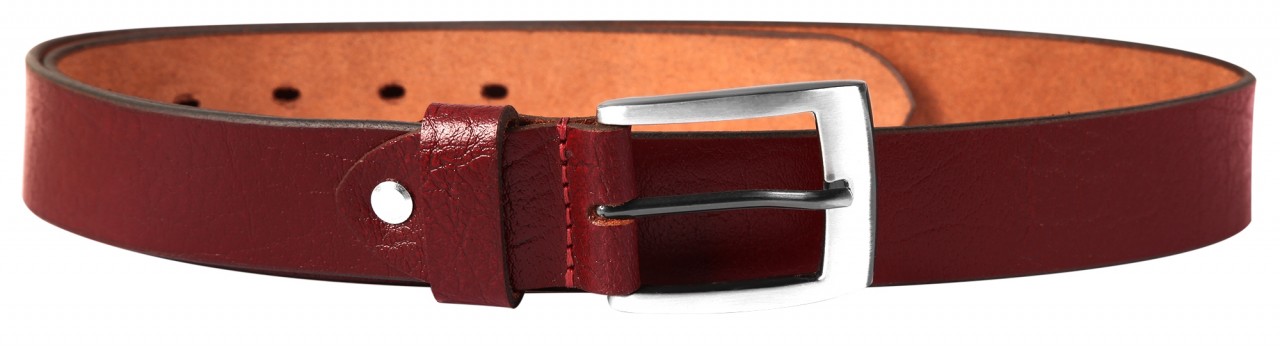 O cinto vermelho escuro de Leonardo Verrelli é feito de couro genuíno de búfalo e tem uma superfície levemente granulada.