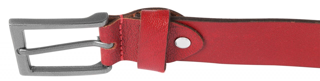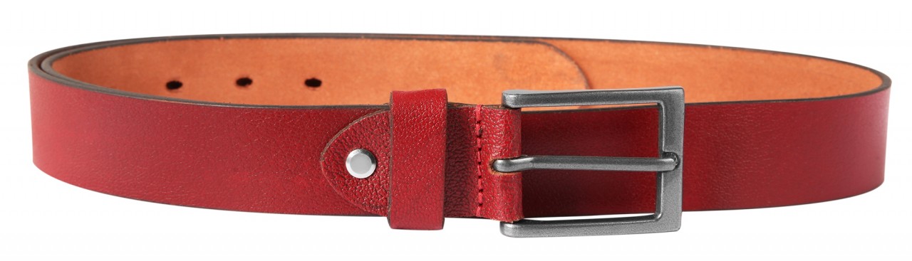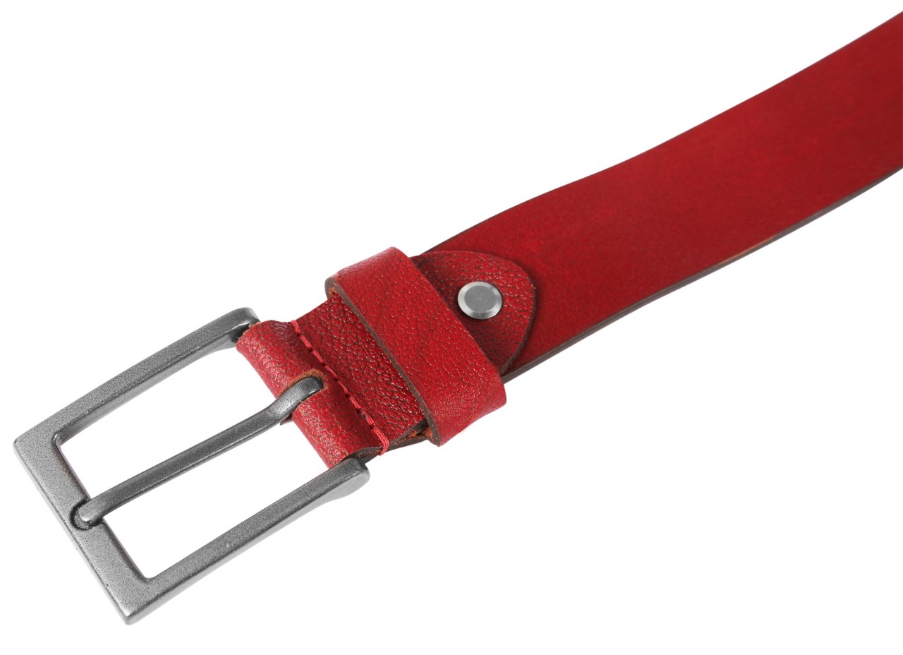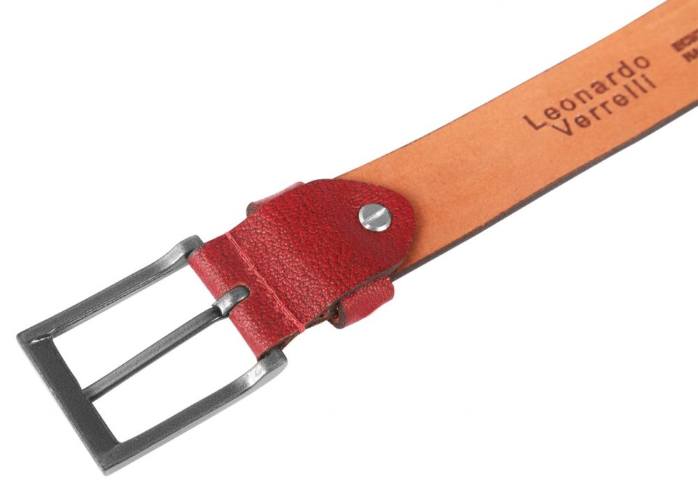O cinto vermelho escuro de Leonardo Verrelli é feito de couro genuíno de búfalo e tem uma superfície levemente granulada e áspera.