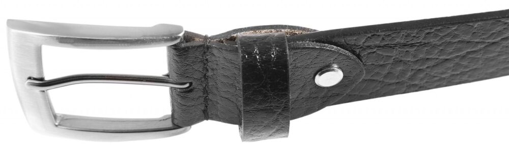 O cinto masculino preto da marca Leonardo Verrelli é feito de couro genuíno e tem uma superfície lisa com granulação sutil. O cinto tem 3,4 cm de largura e 3,5 mm de espessura. Está disponível em tamanhos de cintura de 90 cm a 140 cm. O cinto tem uma fivela de metal prateada costurada à mão. Os furos estão espaçados de 2 em 2 cm. Uma característica especial é que o cinto pode ser encurtado para qualquer comprimento. Para fazer isso, use uma chave de fenda para afrouxar um parafuso embaixo da fivela do pino e simplesmente ajuste o cinto no comprimento desejado.