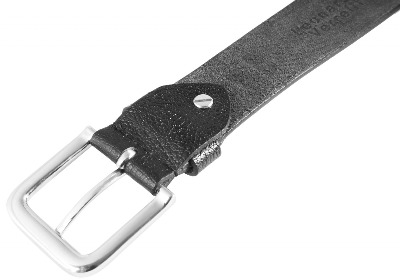 O cinto masculino preto da marca Leonardo Verrelli é feito de couro genuíno e tem uma superfície lisa com granulação sutil. O cinto tem 3,9 cm de largura e 4 mm de espessura. Está disponível em tamanhos de cintura de 90 cm a 140 cm. O cinto tem uma fivela de metal prateada costurada à mão. Os furos para o mandril estão espaçados de 2,0 cm. Uma característica especial é que o cinto pode ser encurtado para qualquer comprimento. Para fazer isso, use uma chave de fenda para afrouxar um parafuso em baixo da fivela do pino e simplesmente ajuste o cinto no comprimento desejado. O cinto masculino é um lindo cinto de lazer que também pode ser usado em ocasiões especiais.