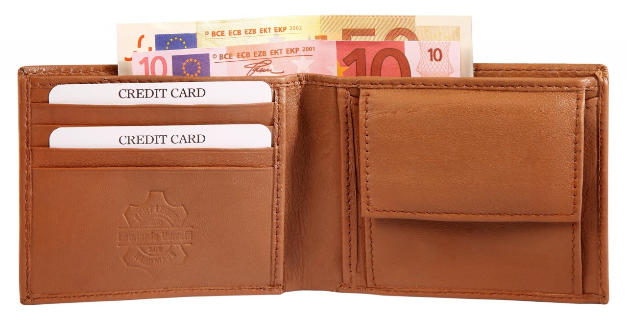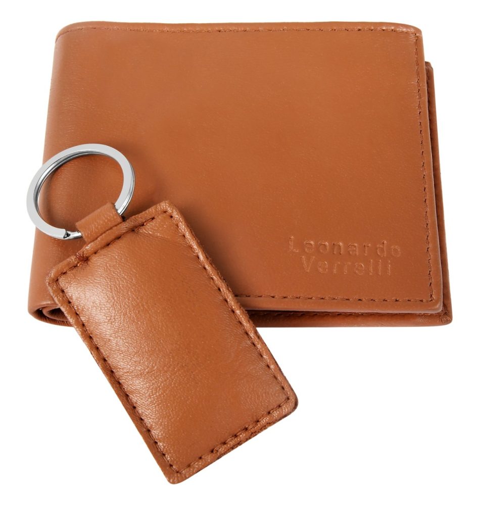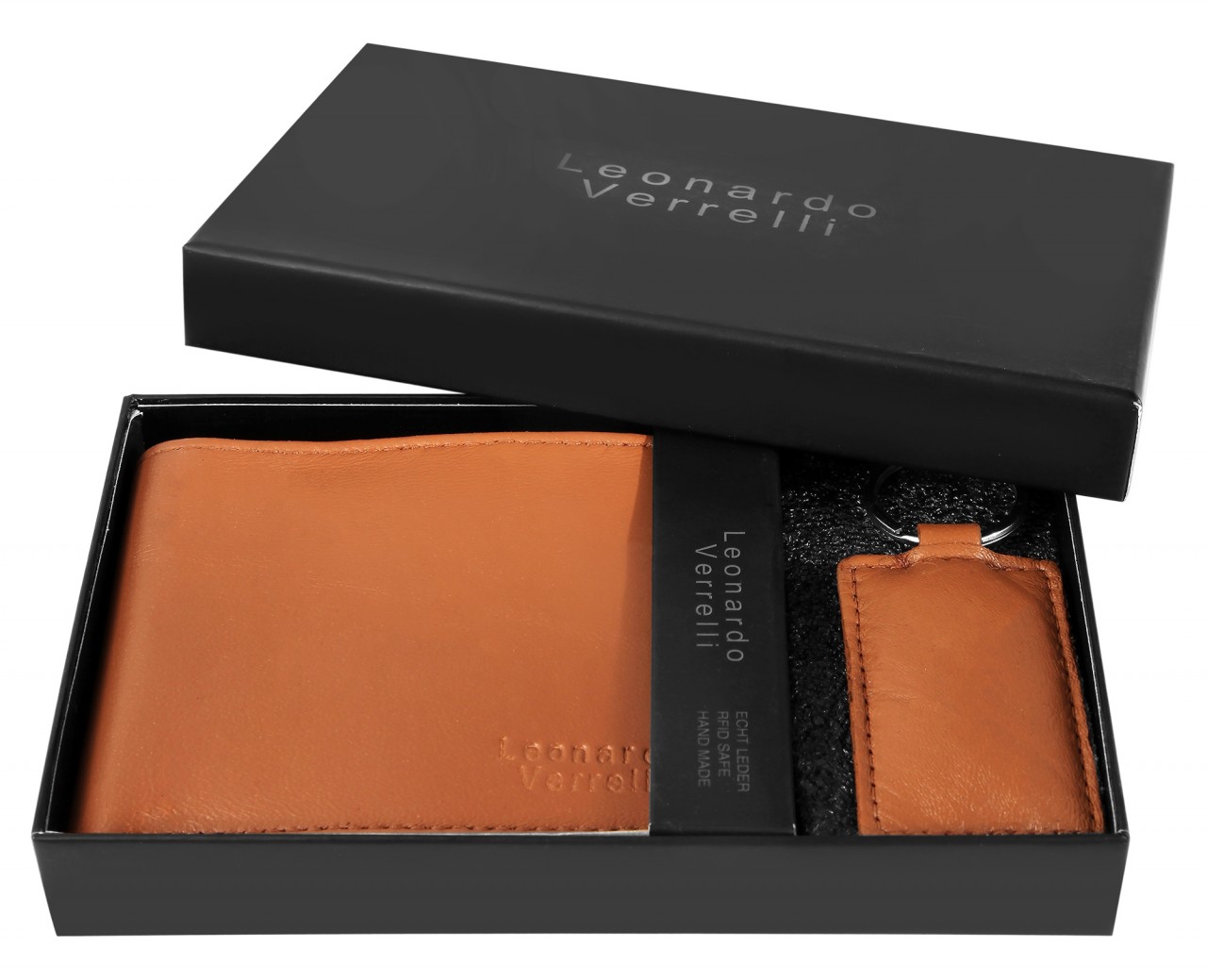 O conjunto presente de duas peças de Leonardo Verrelli consiste em uma carteira e um chaveiro feito de pele de carneiro genuína. A carteira é feita em formato paisagem e oferece muito espaço de armazenamento para todos os documentos importantes. Está dividido em 2 compartimentos para notas, 4 compartimentos para cartões de crédito, 2 bolsos deslizantes e 1 compartimento para moedas com fecho de botão de pressão. O tamanho, sem preenchimento, tem 8,9 cm de comprimento, 11,2 cm de largura e 2 cm de espessura. Graças à proteção RFID integrada, todos os cartões com chip estão protegidos contra ataques fraudulentos. A costura externa e interna da carteira garante boa durabilidade e estabilidade, assim como o porta-chaves. Também é feito de couro genuíno e tem a cor combinada com a carteira. O pingente é preso a um chaveiro com uma argola de couro.
