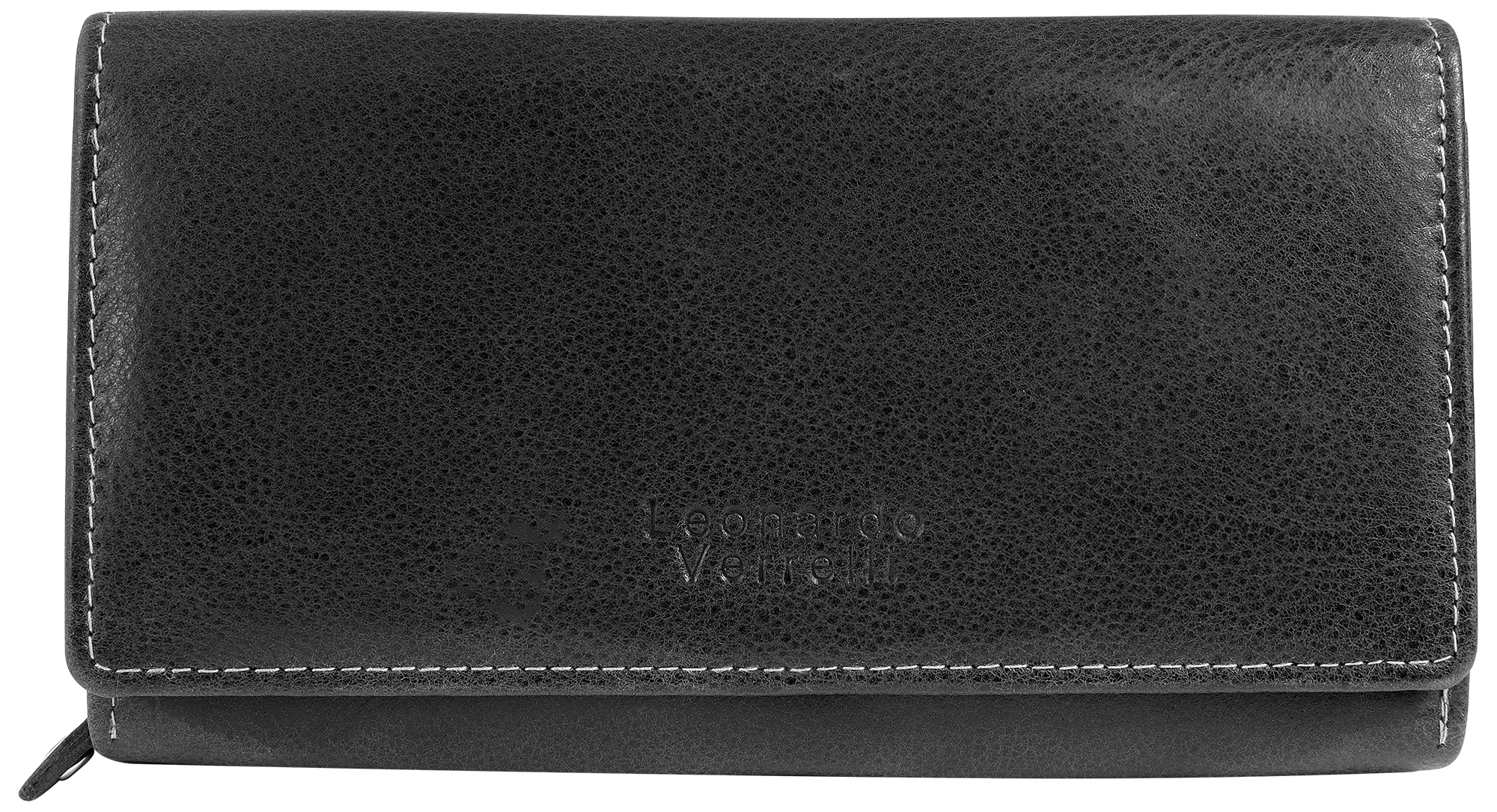 - A carteira de mulher Leonardo Verrelli, fabricada em pele de vaca 100% genuína e acabada com um aspeto caraterístico de lavagem de pedra, que confere à pele um toque único e suave e um aspeto de uso individual.