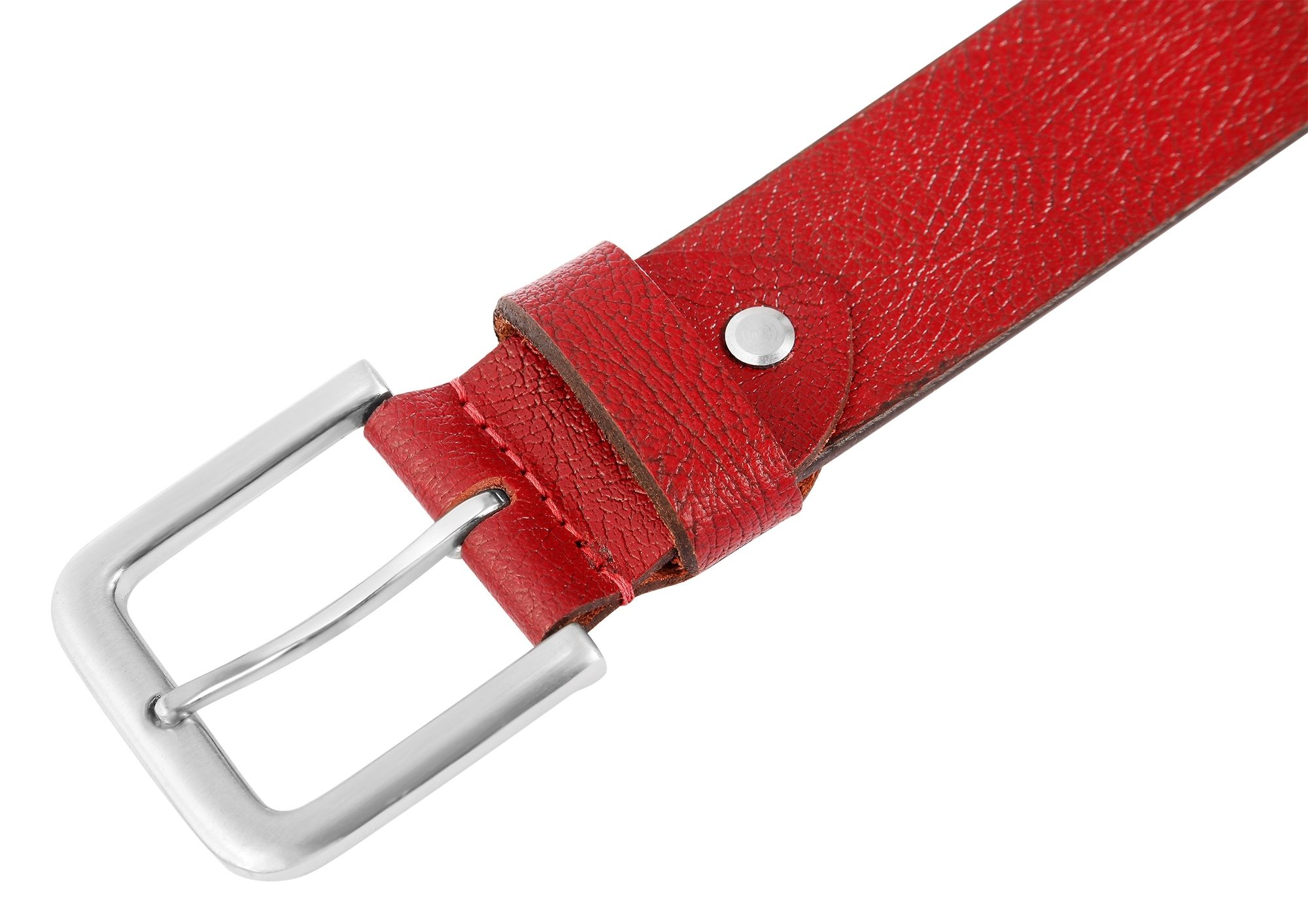 - O cinto vermelho escuro de Leonardo Verrelli é feito de couro de búfalo genuíno e tem uma superfície levemente granulada.