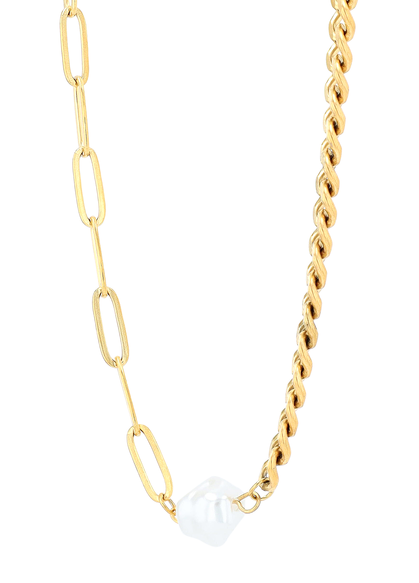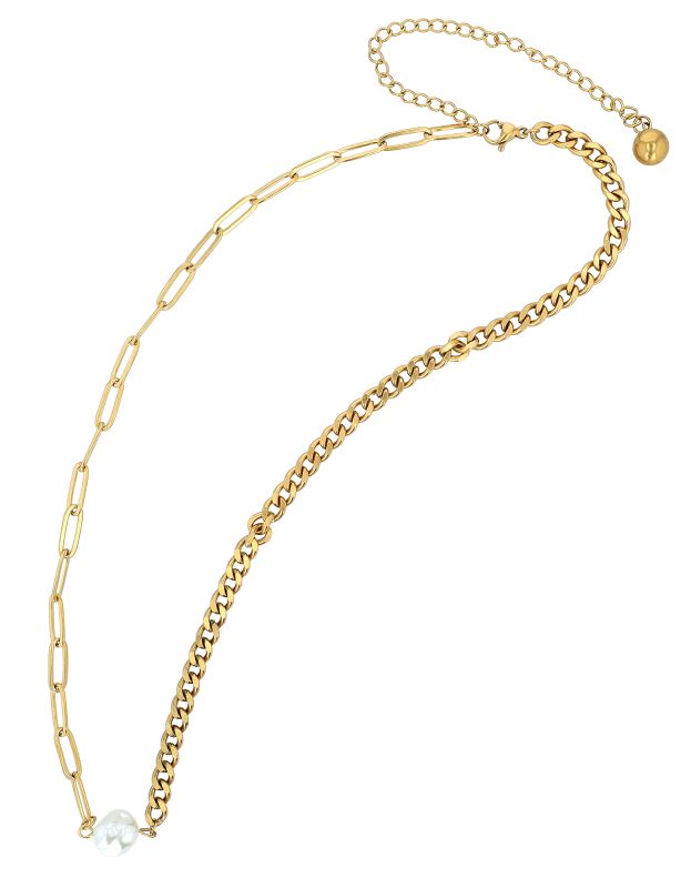 O colar de duas partes combina harmoniosamente dois estilos de elos diferentes. Um lado apresenta uma corrente clássica e robusta, enquanto o outro exibe elos grossos e marcantes (estilo clipe de papel). As duas seções são separadas por uma elegante pérola branca (aproximadamente 9 mm de diâmetro), que serve como elemento unificador no centro.