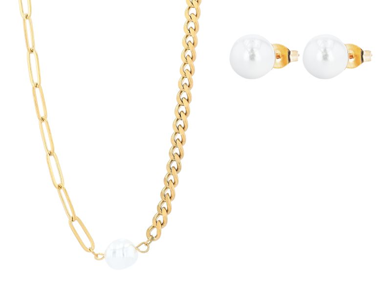 O conjunto é composto por um colar marcante e brincos de pérola combinando, com um design arrojado feito em aço inoxidável dourado de alta qualidade para um brilho duradouro.
