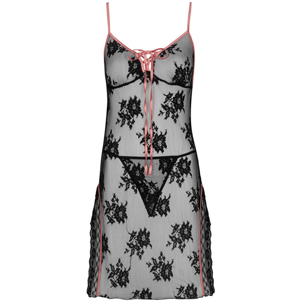 A coleção Karonin Dubarry é um conjunto composto por uma camisola sensual e uma tanga preta combinando. O conjunto é feito de renda macia e vazada e decorado adicionalmente com uma sutil fita rosa pó amarrada no busto. Uma combinação tão contrastante de rosa doce e preto forte faz com que a roupa acrescente coragem e autoconfiança. Por sua vez, o material do conjunto garante que sua usuária se sinta o melhor possível em seu próprio corpo. A renda é confeccionada em poliamida agradável ao toque, que não risca e se adapta bem ao formato da figura feminina.