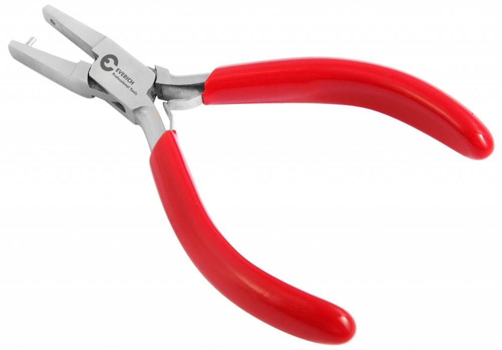 O furador para pulseiras de relógio é feito de aço inoxidável e se ajusta particularmente bem à mão devido ao revestimento de plástico vermelho. O alicate é adequado para fazer furos precisos em tiras de couro. O mandril para furos tem espessura de 1,7 mm. As dimensões resultam de um comprimento de 13,1 cm, uma largura de 5,7 cm e uma espessura de material de 7,9 mm. A cabeça do alicate é cônica e a ponta tem 6,2 mm de largura.