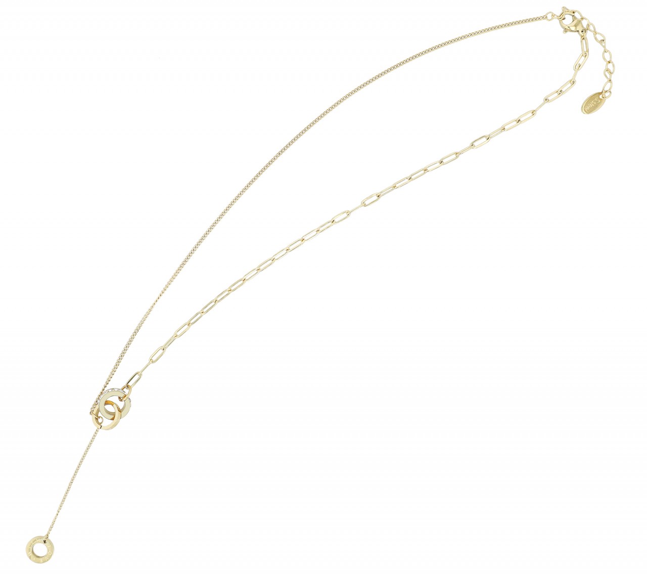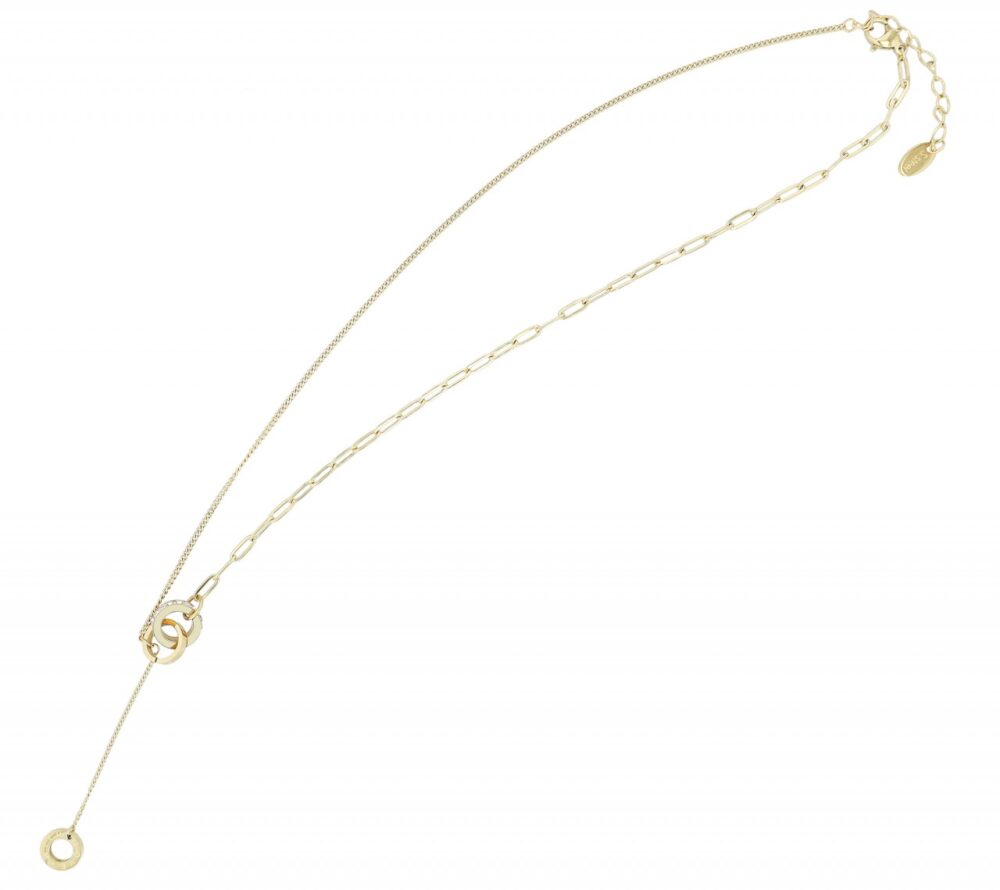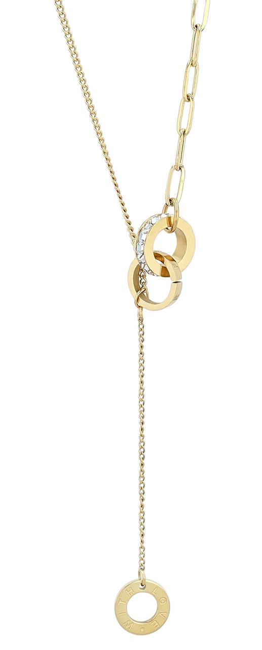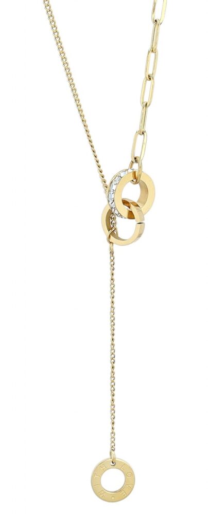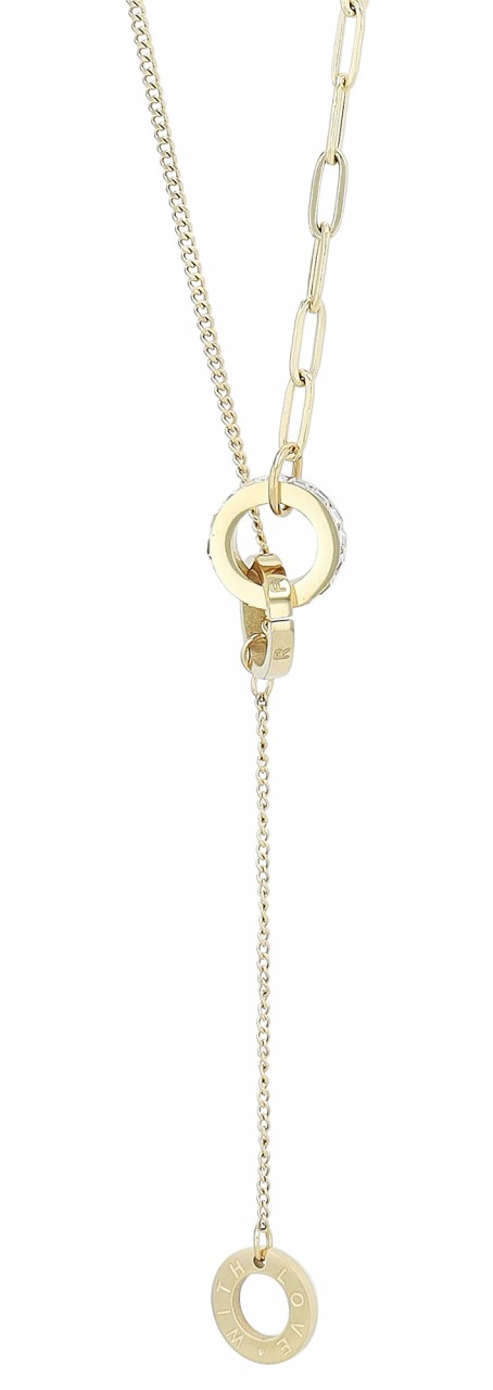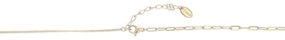 O colar dourado é feito de aço inoxidável e tem metade padrão plano e metade padrão âncora. Em ambas as extremidades da corrente há anéis entrelaçados, o maior decorado ao redor com pedras ornamentadas e o menor gravado com as palavras "FOR EVER". Outro anel com a inscrição "COM AMOR" cm está preso a uma corrente. A corrente de joias moderna pode ser aberta e fechada com um mosquetão, que também é feito de aço inoxidável. Além disso, uma corrente de extensão de 5 cm de comprimento é presa a uma extremidade do colar para que ele possa ser adaptado a qualquer roupa. As dimensões são baseadas em um comprimento de 43,5 cm e uma espessura…