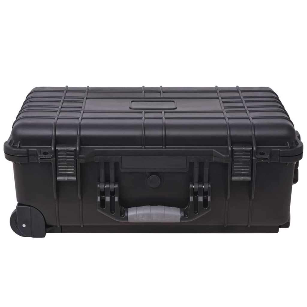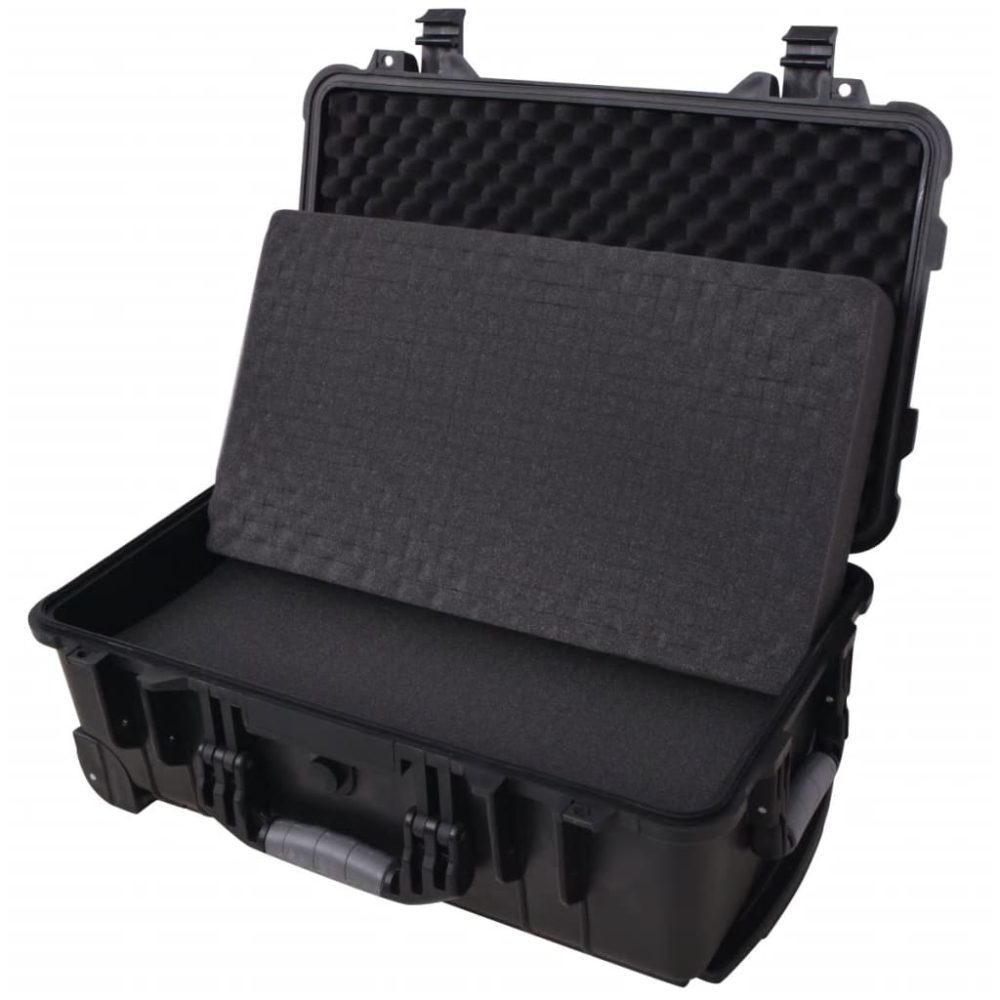 Esta mala de ferramenta com espuma inserida está equipada com rodas, feita de polipropileno é resistente a arranhões, é impermeável, à prova de esmagamento e à prova de poeira, ideal para transportar instrumentos frágeis ou equipamento fotográfico ou qualquer outro equipamento eléctrico delicado. Há um bocado de espuma relativamente fino na parte inferior da mala, funcionando apenas como o tapete de espuma. Dois bocados de espuma muito densa são inseridos para acomodar o seu equipamento para uma proteção máxima. A mala de ferramenta é equipado com duas rodas e uma pega telescópica ajustável para ajudá-lo a levar a mala durante viagens. O seu acabamento preto torna-a mais durável para anos de uso. Tem uma fechadura com 2 cadeados para o máximo de segurança (os cadeados não estão incluídos).