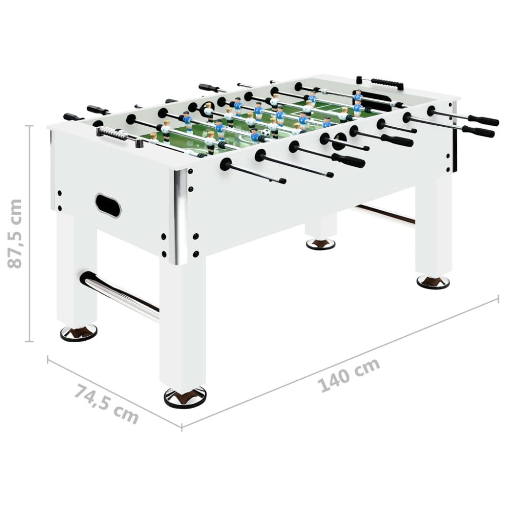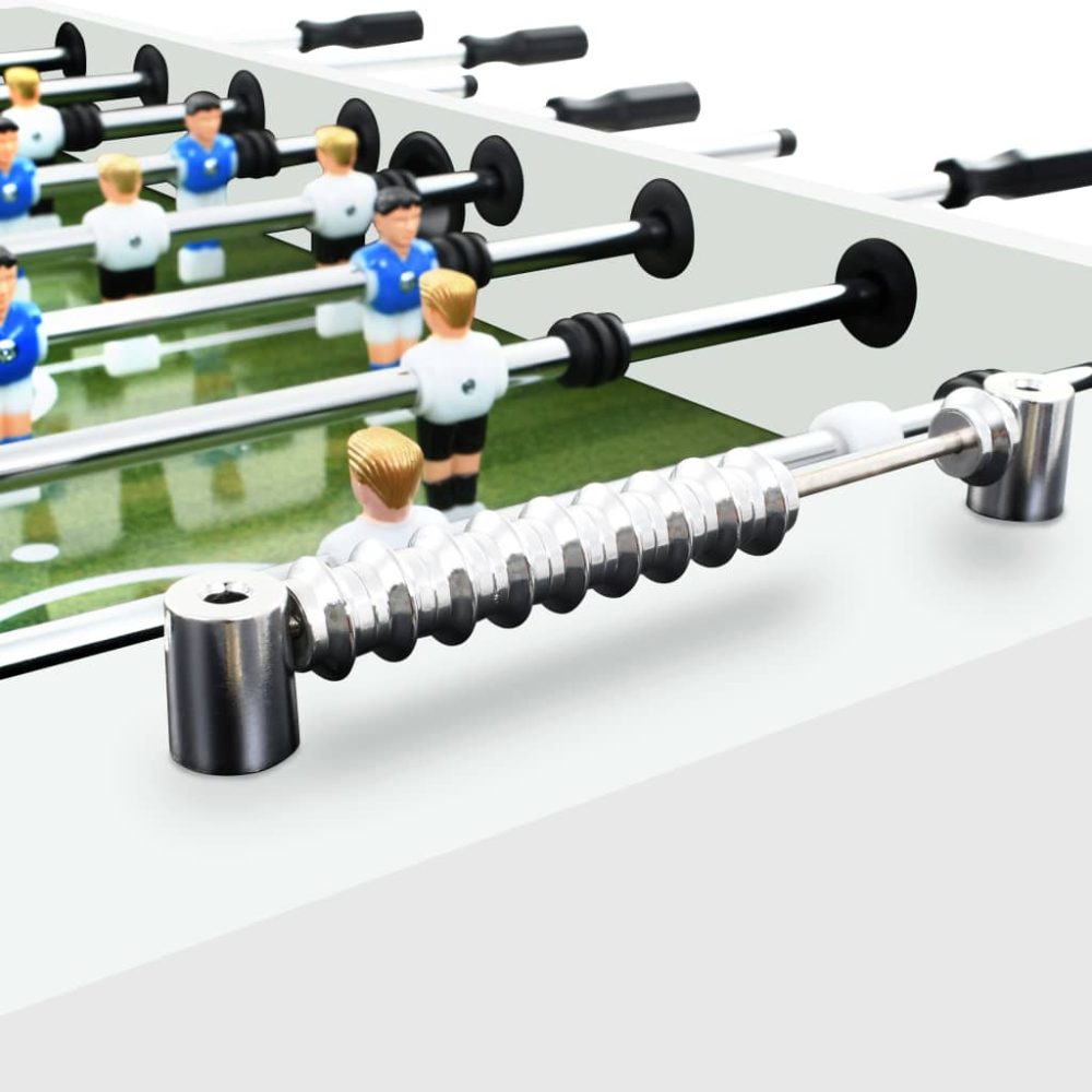 A mesa é feita de MDF e tem pernas estáveis, fazendo com que seja conveniente de usar e oferecendo uma ótima relação desempenho/preço. As dimensões do campo estampado estão em conformidade com as normas dos torneios oficiais, proporcionando-lhe assim uma experiência de jogo realista. A mesa está equipada com barras de bonecos deslizantes com manípulos antiderrapantes, para uma experiência de jogo fácil e confortável. As pernas são ajustáveis em altura para proporcionar mais flexibilidade. Será entregue uma mesa de matraquilhos completa, incluindo 2 balizas, 2 bolas, 2 placares, 8 barras com jogadores e 22 jogadores.