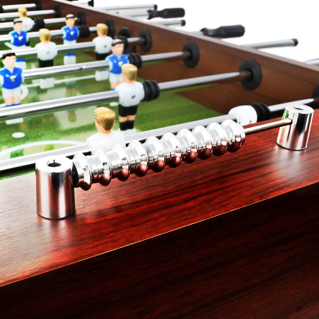 A mesa é feita de MDF e tem pernas estáveis, fazendo com que seja conveniente de usar e oferecendo uma ótima relação desempenho/preço. As dimensões do campo estampado estão em conformidade com as normas dos torneios oficiais, proporcionando-lhe assim uma experiência de jogo realista. A mesa está equipada com barras de bonecos deslizantes com manípulos antiderrapantes, para uma experiência de jogo fácil e confortável. As pernas são ajustáveis em altura para proporcionar mais flexibilidade. Será entregue uma mesa de matraquilhos completa, incluindo 2 balizas, 2 bolas, 2 placares, 8 barras com jogadores e 22 jogadores.