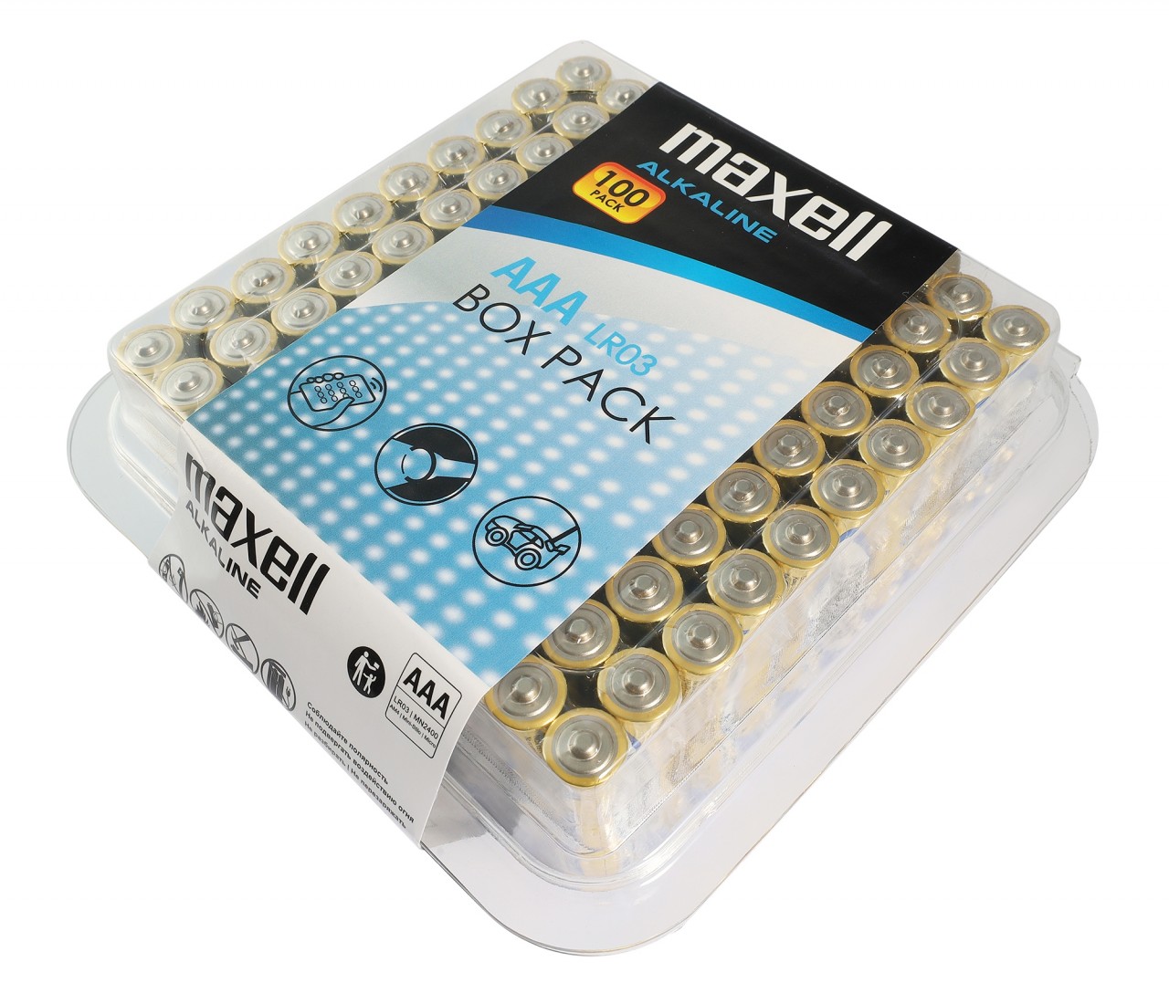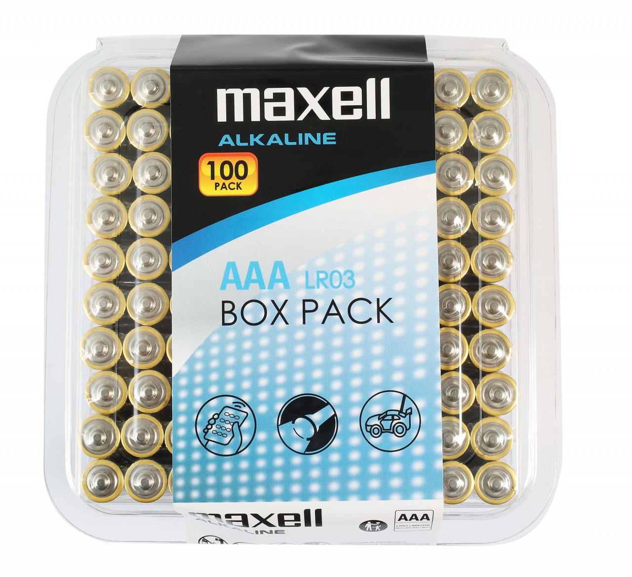 Maxell alcalinas LR03 em embalagem de 100 unidades.