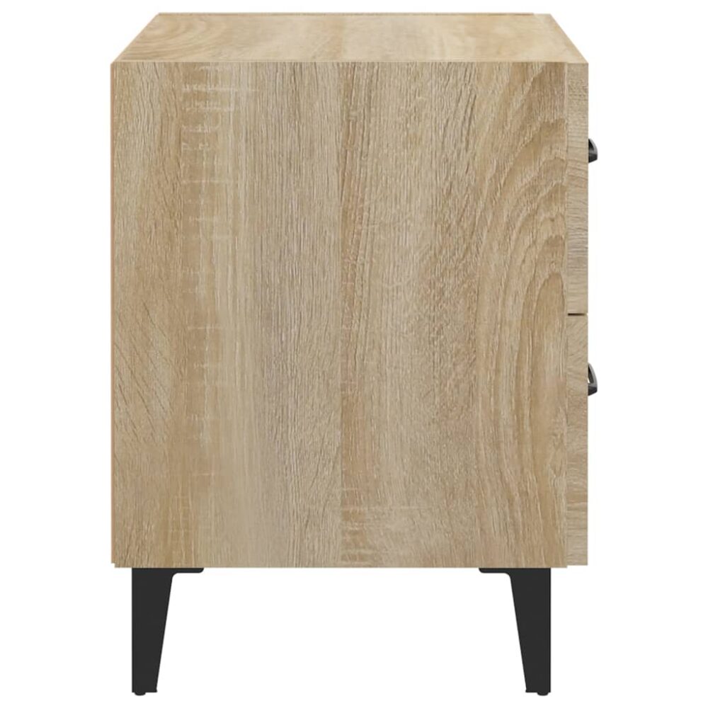 Dê um toque de charme industrial ao seu interior com esta mesa de cabeceira! Material de qualidade: os derivados de madeira possuem uma qualidade excecional e oferecem uma superfície suave bem como força, estabilidade e resistência à humidade.Pernas resistentes: as pernas de metal acrescentam um estilo industrial encantador ao seu interior, ao mesmo tempo que garantem estabilidade. Espaço de arrumação amplo: a mesa de cabeceira possui duas gavetas com pegas de metal. As gavetas espaçosas permitem-lhe manter as suas coisas organizadas. Tampo robusto: o tampo robusto da mesa de cabeceira é ideal para expor objetos decorativos, molduras de fotografias, ou vasos com plantas.