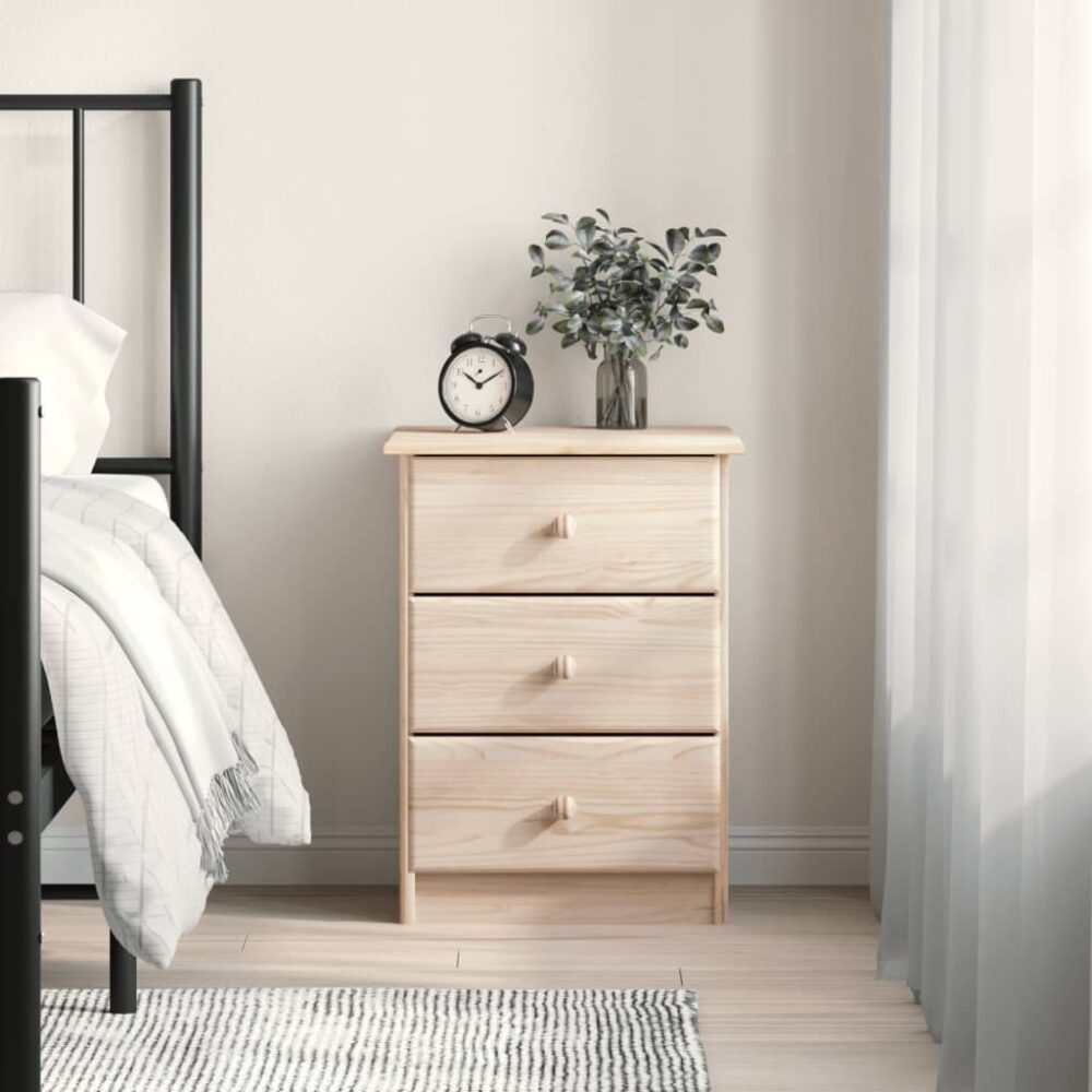 Com um design elegante, esta mesa de cabeceira em madeira adapta-se facilmente ao seu quarto ou sala de estar e acrescenta um charme intemporal ao seu interior. Madeira de pinho maciça: a madeira de pinho maciça é um bonito material natural. A madeira de pinho possui um grão reto e os nós conferem ao material o seu aspeto rústico. Feita em madeira de pinho maciça, a mesa de cabeceira é durável e resistente.Amplo espaço de arrumação: o móvel de quarto apresenta 3 gavetas convenientes para ajudar a manter os seus artigos essenciais à mão.Fácil de cuidar: a mesa de cabeceira é fácil de limpar com um pano húmido e requer menos manutenção.Puxadores de madeira: a gaveta da mesa de cabeceira possui puxadores de madeira que fazem com que seja mais fácil abrir e fechá-la, ao mesmo tempo que atribui uma beleza adicional.Superfície não tratada: como a mesinha de cabeceira foi concebida a partir de madeira de pinho maciça sem acabamento, poderá manter a sua cor natural ou poderá pintá-la e envernizá-la de acordo com as suas preferências. Atenção:Para evitar que o produto se vire, deve utilizar o dispositivo de fixação na parede fornecido.