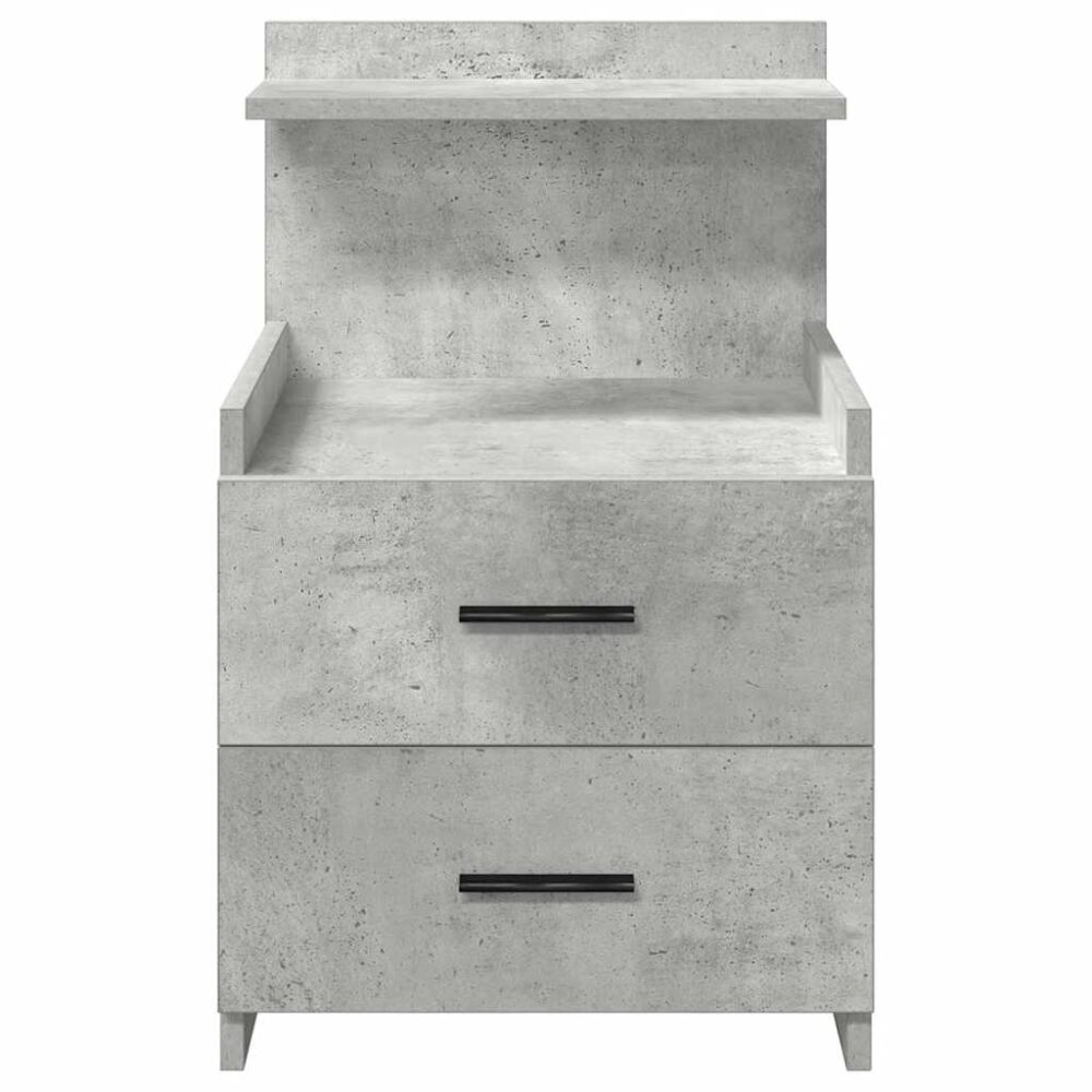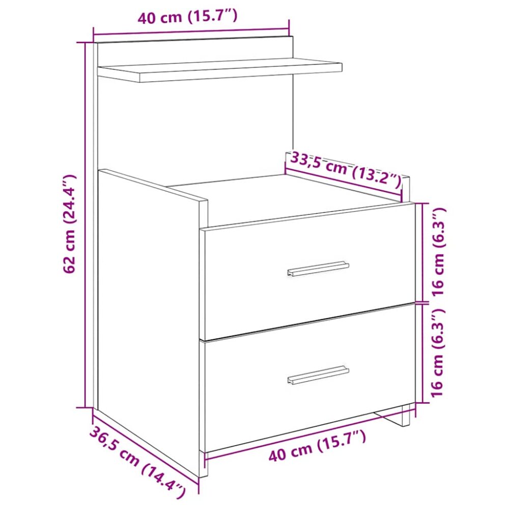 Seja para pegar seu livro favorito ou guardar seus itens essenciais para a noite, este criado-mudo combina estilo e praticidade, tornando-se uma ótima escolha para sua cabeceira. Material estável e durável: a madeira projetada é um material durável e estável com uma superfície lisa que é resistente à umidade, empenamento e rachaduras, tornando-se uma escolha confiável para uma variedade de projetos.Amplo armazenamento: o armário oferece amplo espaço de armazenamento com duas gavetas e uma prateleira de armazenamento aberta, permitindo que você organize e armazene itens como livros, revistas ou pertences pessoais, mantendo seu quarto organizado.Uso prático: com uma altura ideal para fácil acesso da cama, esta mesa foi projetada para funcionalidade e conveniência. As gavetas possuem puxadores práticos, garantindo uma abertura suave e sem esforço.Fácil de manter: Graças à sua superfície lisa, o armário é fácil de limpar com um pano úmido e requer menos manutenção. Aviso:Para evitar que ele tombe, este produto deve ser usado com o dispositivo de fixação na parede fornecido.