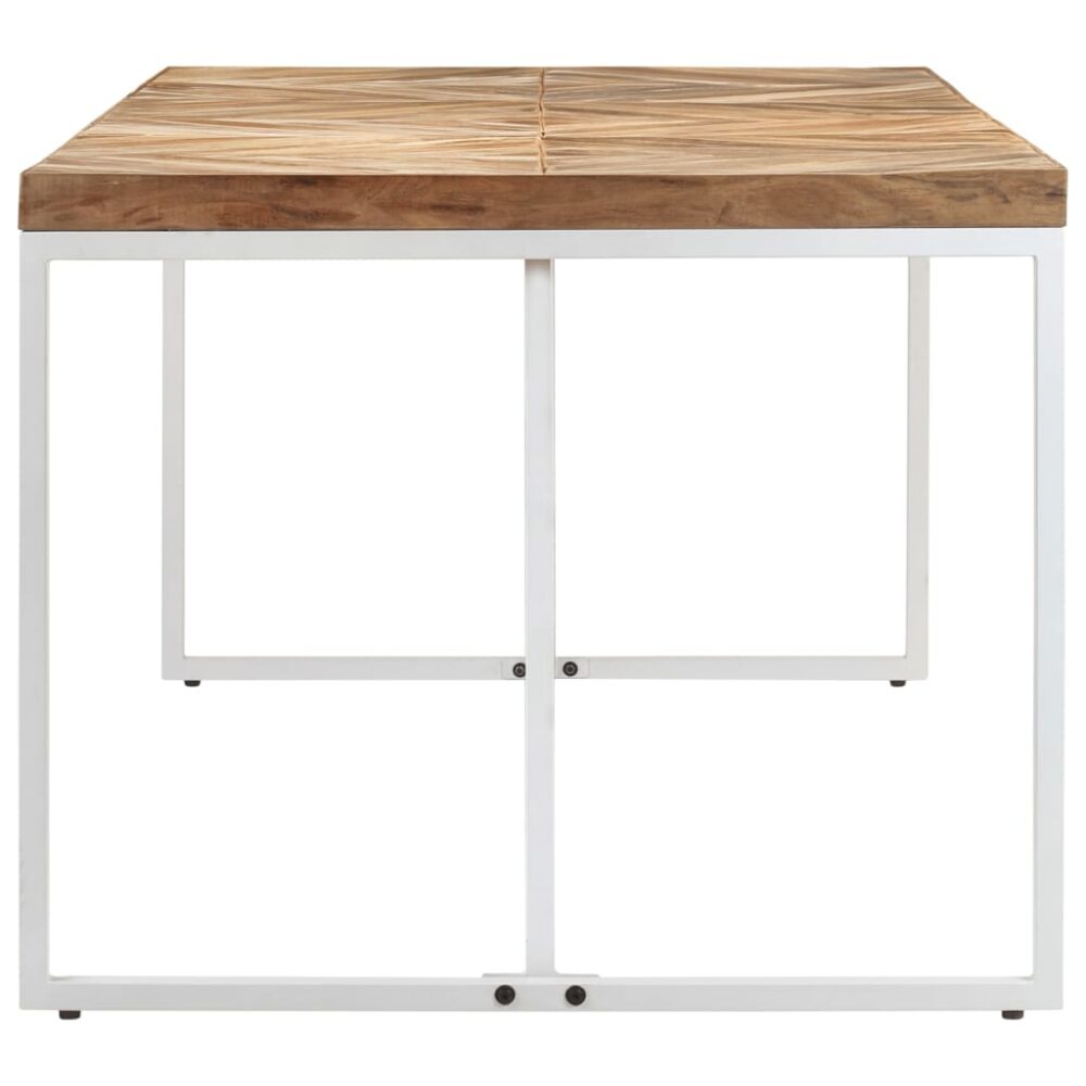 Feita à mão com madeira de acácia maciça e madeira de mangueira, esta mesa de jantar é muito estável e durável. As pernas de aço revestido a pó branco garantem uma estabilidade extra. O robusto tampo apresenta um design com um padrão chevron e mosaico, tornando-o uma decoração especial para o seu interior. Também pode ser usada para colocar bebidas ou comida.