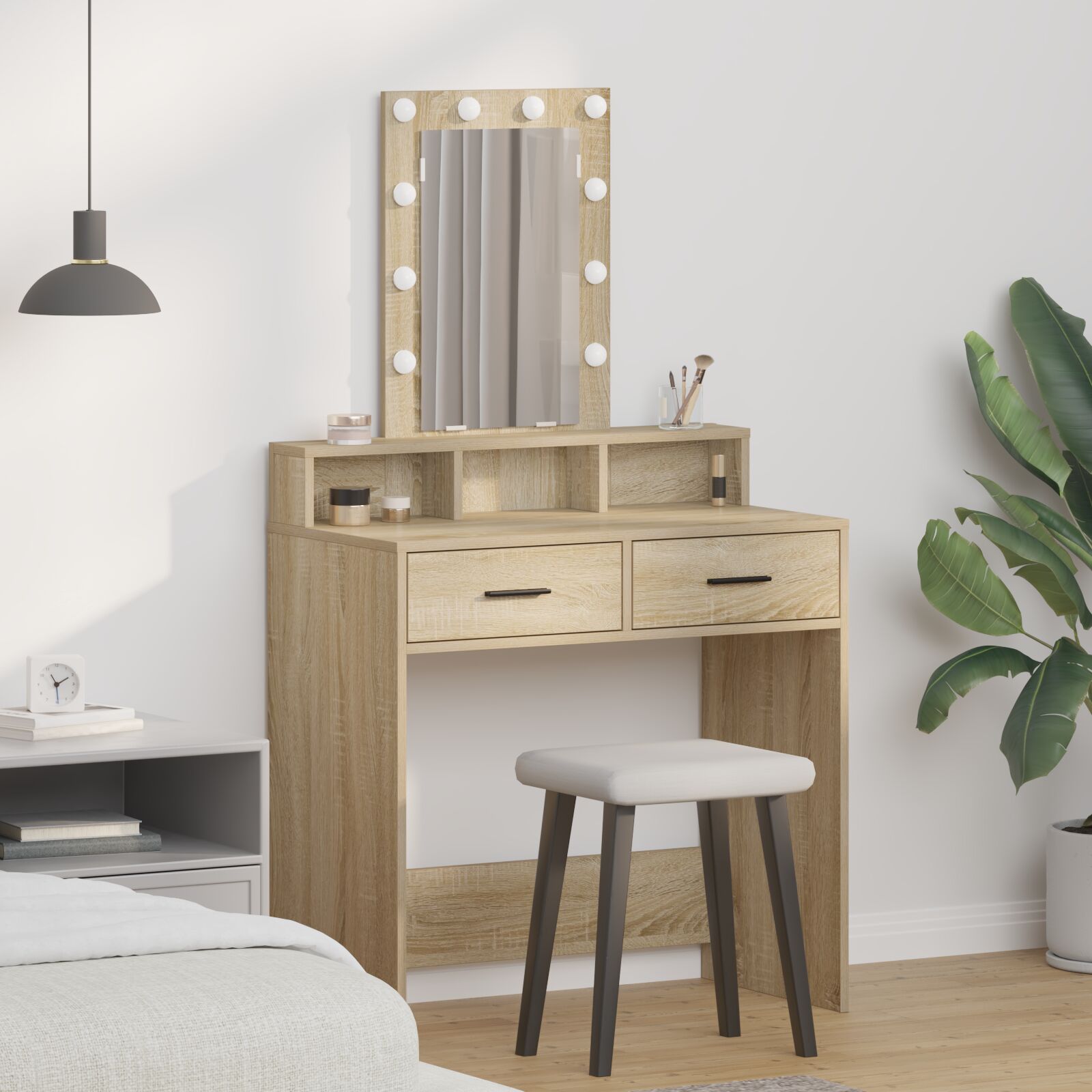 Esta Unidade de Toucador Contempornea em Carvalho Sonoma combina estilo com praticidade, perfeita para quem precisa de um espao para cuidar da beleza. Com linhas limpas e um design moderno, serve bem para rotinas de beleza, seja num cantinho do quarto ou como um elemento elegante no banheiro. Com gavetas espaosas, tudo fica organizado e fcil de acessar. Com 79 x 41 x 140 cm, esta unidade transforma qualquer espao num local de tocador estiloso. ideal para quem adora maquilhagem ou para quem quer agilizar o ritual matinal, oferecendo conforto e durabilidade com iluminao LED embutida e construo em madeira slida. Por favor, utilize apenas entrada certificada de 5V DC. Uma voltagem superior pode causar sobreaquecimento, danificar o dispositivo e…