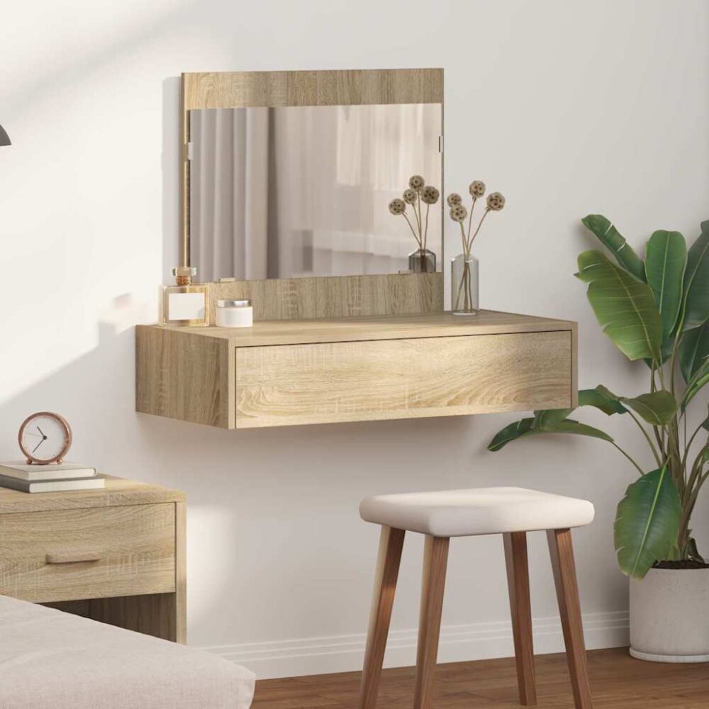O Toucador Moderno de Carvalho Sonoma indispensvel para quem procura mveis bonitos e prticos para cuidados pessoais. Ideal para quartos, combina um design minimalista e elegante com funcionalidade. Com uma gaveta clssica e um espelho integrado, perfeito para manter tudo organizado. Esta pea elegante ptima para maquilhagem, cuidados pessoais ou para dar um toque especial ao ambiente do quarto. O seu design e acabamento modernos adaptam-se a diferentes estilos de quartos e so fceis de manter limpos.