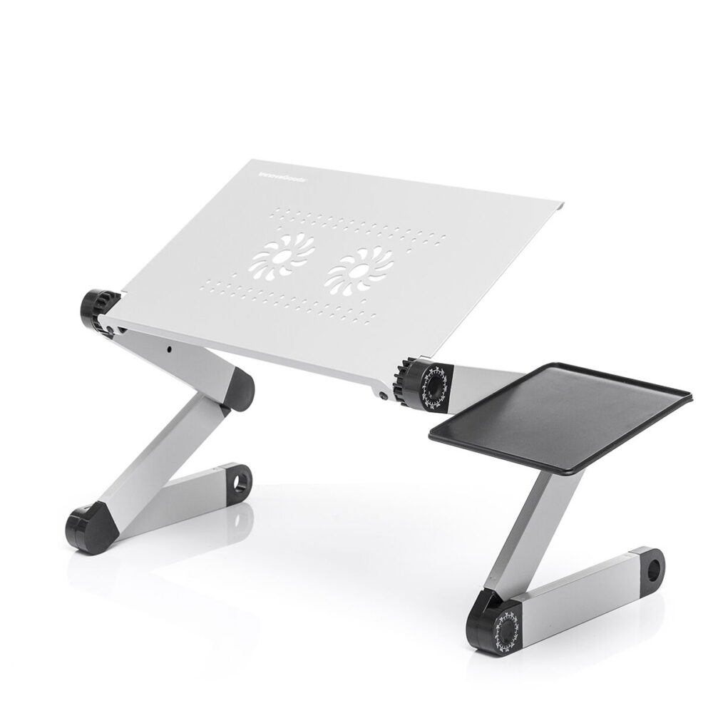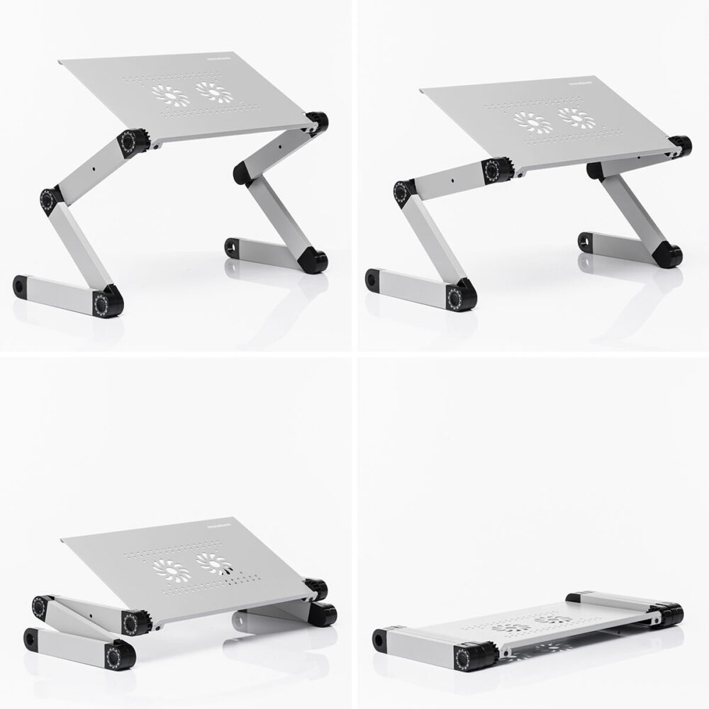Uma mesa multifuncional ajustável, ideal para trabalhar com o seu portátil, mas também muito útil para comer, utilizar como atril, etc. Graças à sua grande versatilidade e ao seu design dobrável adaptável, pode ser utilizada em diferentes posições: com a pessoa sentada numa cadeira ou no chão, deitada, de pé sobre uma superfície estável, etc. A mesa dispõe de um tabuleiro independente para o rato e de duas pernas articuladas de 3 pontos com rotação de até 360º, para que possa ser ajustada em altura e inclinação, oferecendo um número infinito de possibilidades para se adaptar totalmente às necessidades de cada momento. A sua base de apoio em alumínio com perfurações promove a ventilação e reduz o aquecimento. Inclui ainda um manual com as posições recomendadas para diferentes funções.