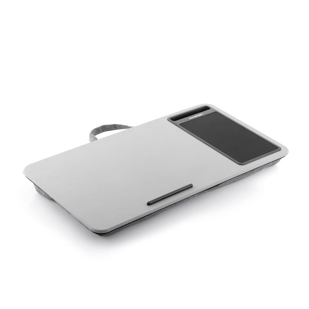 Esta é uma mesa para portátil com uma cómoda almofada integrada na base de apoio, a qual lhe permite trabalhar confortavelmente. O tabuleiro superior em material rígido proporciona uma ampla superfície de trabalho e garante a aderência firme e estável do portátil. A mesa inclui igualmente um tapete de rato e uma ranhura para smartphones. A parte inferior é composta por duas almofadas de tamanhos diferentes, que proporcionam uma inclinação ótima quando colocadas no colo sobre as pernas. Esta mesa original tem um design ergonómico, moderno e elegante e é compacta e leve. Graças à sua pega de transporte, pode ser facilmente transportada para qualquer local, para além de ser muito fácil de guardar. A sua grande versatilidade e adaptabilidade permite uma panóplia de possibilidades de utilização, como trabalhar no portátil, escrever, desenhar, ler, comer, etc., independentemente do local (cama, sofá, poltrona, etc.). A mesa é fabricada em materiais de elevada qualidade, sendo resistente e durável. Ideal para manter a ordem e aproveitar ao máximo o espaço disponível.