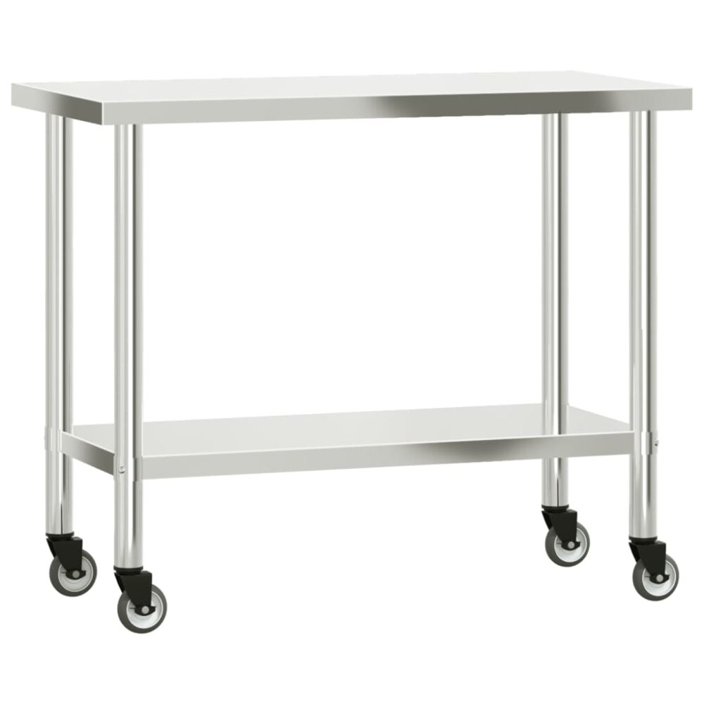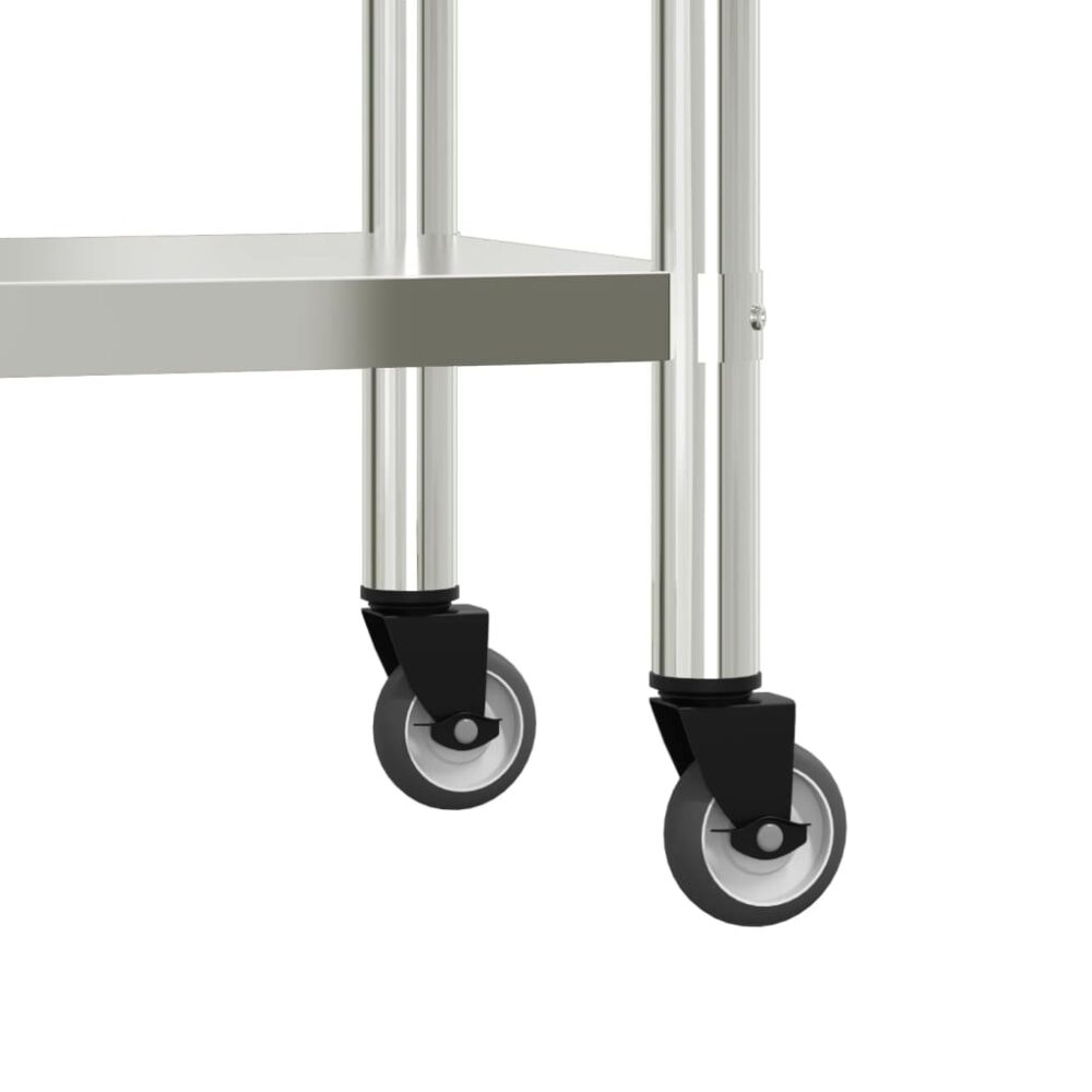 Esta mesa de trabalho para cozinha é perfeita para a preparação e arrumação de alimentos e é ideal para um bar de cozinha, restaurante, escola e outros espaços comerciais. Construção durável e estável: a mesa de trabalho é feita de aço inoxidável, proporcionando resistência à corrosão e ferrugem para uma utilização duradoura de confiança. A superfície lisa é fácil de limpar e cuidar, garantindo uma zona de preparação de alimentos higiénica.Amplo espaço de trabalho: a mesa de preparação em aço inoxidável foi concebida com uma prateleira inferior e uma superior, para um espaço de arrumação personalizado, proporcionando um espaço amplo para o seu micro-ondas, utensílios de cozinha e quaisquer outras ferramentas que possa precisar.Movimento flexível: a mesa de preparação está equipada com 4 rodas, o que faz com que seja mais fácil e cómodo deslocá-la para onde quer que precise. Além disso, 2 das rodas podem ser bloqueadas para um maior controlo e segurança. Atenção:Para evitar que tombe, este produto deve ser utilizado com o dispositivo de fixação na parede fornecido.