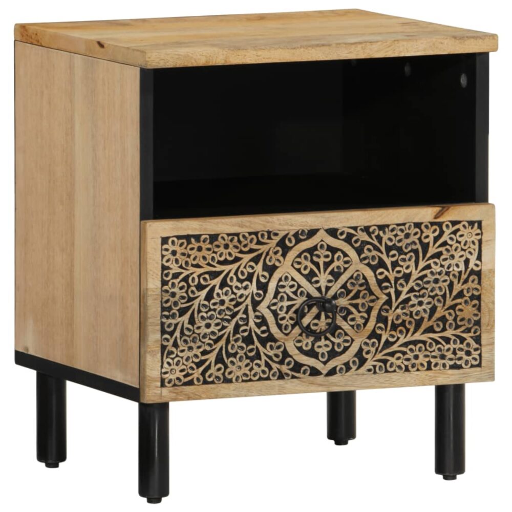 Estas mesas de cabeceira em madeira com um design elegante são um complemento intemporal para a decoração do seu interior. Madeira de mangueira maciça: a madeira de mangueira maciça é uma madeira de lei tropical utilizada para produzir móveis robustos. Os bonitos grãos da madeira tornam cada peça de mobiliário ligeiramente diferente das restantes. Feito em madeira de mangueira maciça, este armário é extremamente estável e durável.Amplo espaço de arrumação: a mesa de cabeceira foi concebida com 1 gaveta e 1 compartimento para manter as coisas organizadas e ao seu alcance.Tampo estável: o tampo deste móvel de apoio é perfeito para expor os seus artigos decorativos, molduras e vasos com plantas.Pernas robustas: as pernas de ferro contribuem para a robustez e estabilidade desta peça de mobília para quarto.Estilo retro: a mesa de cabeceira com padrões florais esculpidos à mão traz o luxo do estilo retro para o seu interior, sendo o ponto focal da sua divisão. Útil saber:A cor e os grãos variam de peça para peça, tornando cada uma única. A entrega é aleatória, assegurando a exclusividade e a individualidade do seu produto.