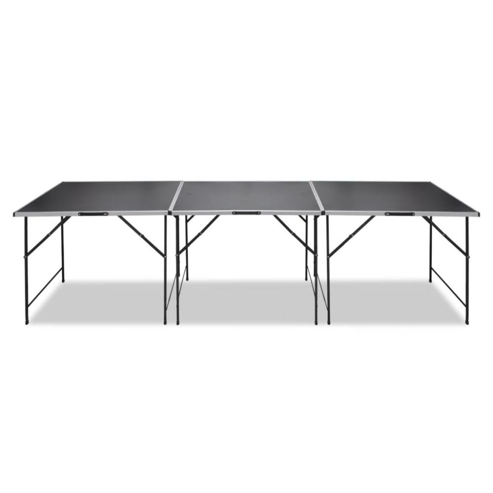 Cada uma das nossas 3 mesas de campismo/trabalho tem uma estrutura feita de alumínio forte e leve e um tampo em MDF preto fácil de limpar. Apoiada por pernas de ferro forte, o conjunto de mesas é muito forte e estável. Estas 3 mesas podem ser conectadas através dos ganchos incluídos. Todas as 3 mesas são dobráveis para portabilidade e podem ser facilmente guardadas quando não estão em uso.