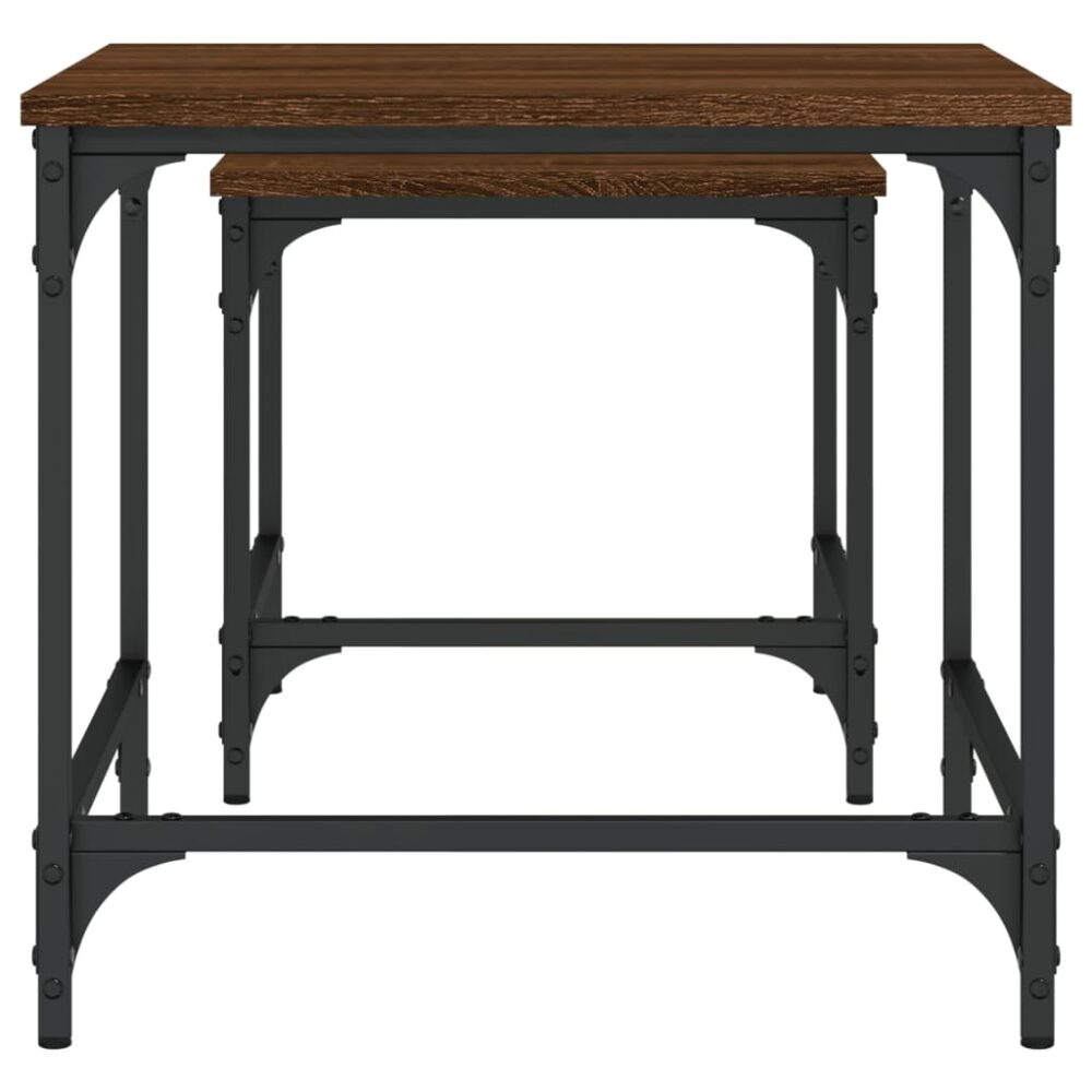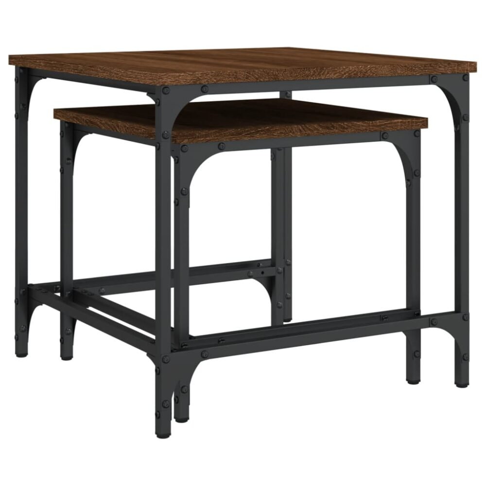 Estas duas mesas de centro de encastrar são uma solução inteligente para espaços pequenos ou para qualquer área com espaço limitado. Com o seu design industrial, este conjunto de mesas de centro dá um toque de elegância à sua sala de estar, quarto ou escritório. Material durável: os derivados de madeira possuem uma qualidade excecional e oferecem não só uma superfície suave mas também força, estabilidade e resistência à humidade. Feita de derivados de madeira, a mesa de centro é fácil de limpar.Design de encastrar: as mesas de encastrar possuem tamanhos diferentes para satisfazer os seus variados requisitos. A mesa mais pequena pode ser encastrada na mesa de centro de maiores dimensões, caso precise de mais espaço.Tampo resistente: o tampo robusto da mesa de apoio de encastrar é ideal para colocar as suas bebidas ou quaisquer outros artigos que precise de ter ao seu alcance.Função versátil: o conjunto de mesas de centro de encastrar é versátil! Qualquer uma das mesas pode ser utilizada como mesinha de cabeceira no quarto, mesa de apoio ou mesa de apoio ao sofá na sala de estar e no escritório.Estrutura de metal: a estrutura de metal acrescenta um estilo industrial no seu interior, enquanto assegura durabilidade e estabilidade.