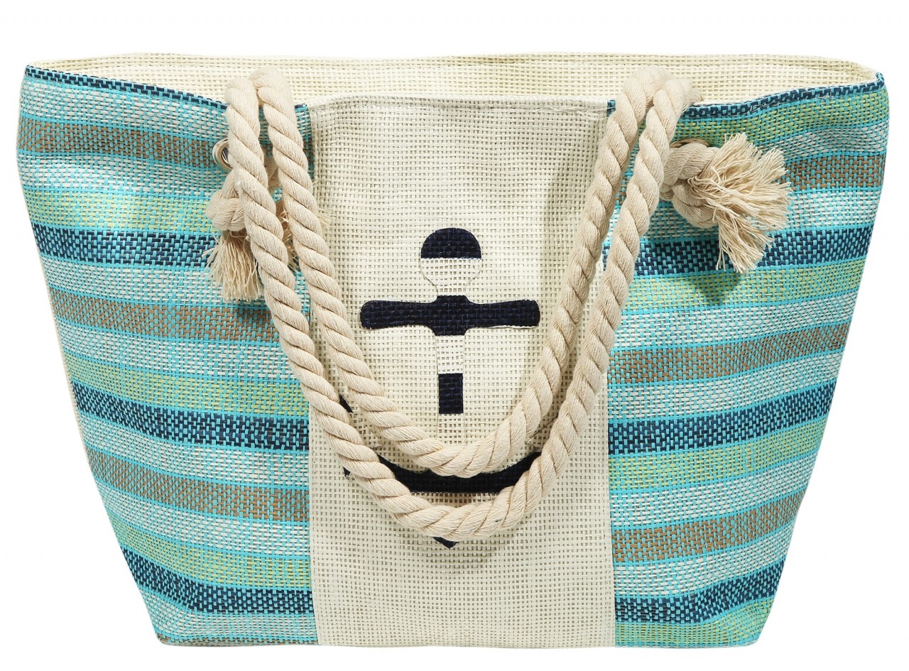 A bolsa de praia marítima com alças de cordão é feita de fibra liberiana e decorada com motivo de âncora e lindas combinações de cores. A bolsa de verão oferece amplo espaço de armazenamento e possui um grande compartimento interno onde todas as coisas importantes podem ser armazenadas e protegidas com um fecho. Há também outro compartimento para telemóvel dentro. É o companheiro perfeito para um dia de praia, mas também para outras atividades de lazer. As dimensões da bolsa são 30 cm de comprimento, 44 ​​cm de largura e 1,0 cm de espessura quando vazia.