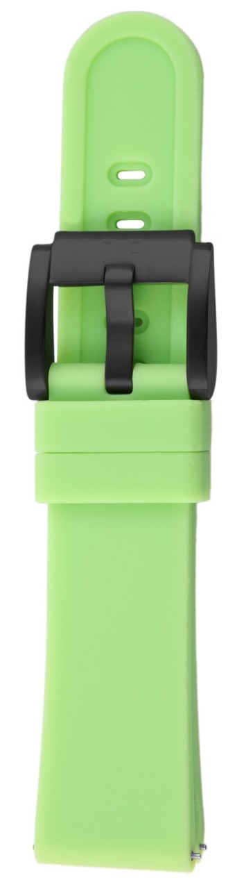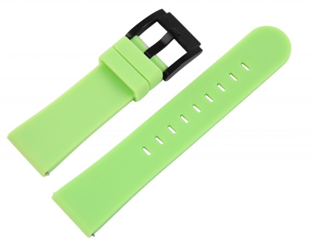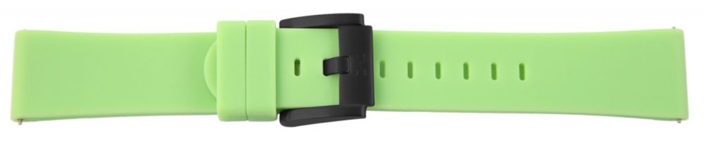 A pulseira verde é feita de silicone e tem uma largura de 22 mm. A espessura do material é de 4 mm, a largura é de 22 mm e o comprimento total é de 21,5 cm. O comprimento total da tira pode ser dividido na parte do fecho com 9 cm e na parte do furo com 11,5 cm. A alça do fecho é 2 mm mais estreita que a largura da alça porque a faixa é estreitamente estreita. A pulseira de substituição do relógio pode ser aberta e fechada usando uma fivela preta.