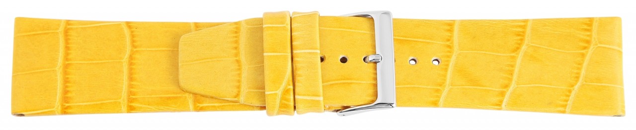 Pulseira clássica de substituição em couro genuíno na cor amarela. É feito do melhor couro bovino e gravado com um design de couro de crocodilo. A pulseira tem uma fivela prateada e duas presilhas. A parte do furo afunila até uma ponta no final.