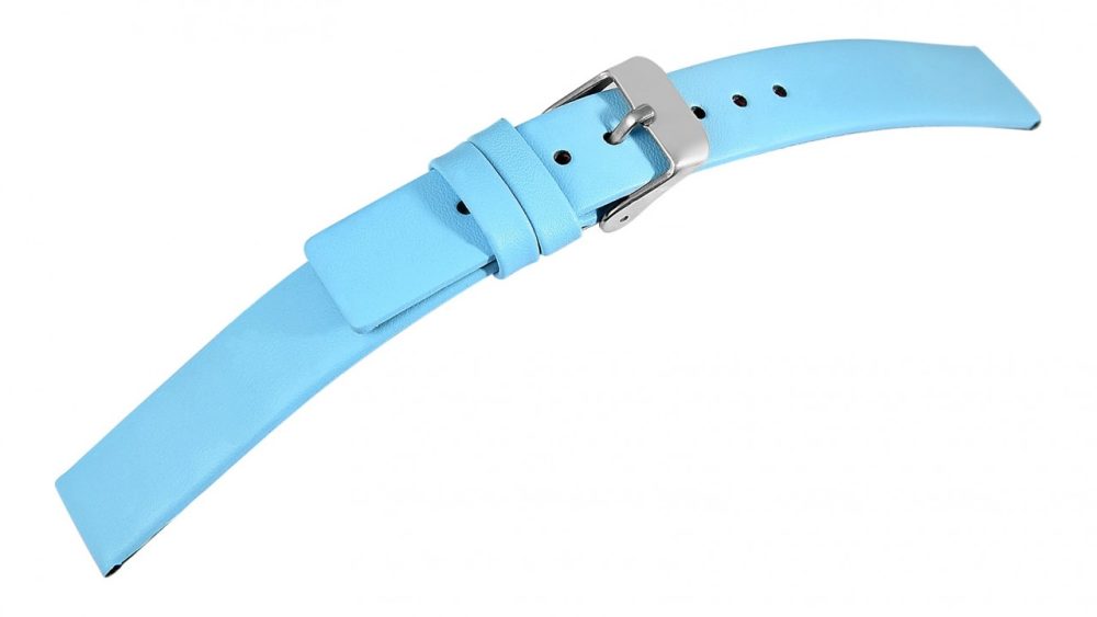 A pulseira do relógio azul claro é feita de couro genuíno e está disponível em larguras de 14 mm, 16 mm, 18 mm, 20 mm e 22 mm. O comprimento total da banda está entre 20,5 cm e 22 cm e a espessura do material é de 3 mm. O comprimento depende da largura do talão. A pulseira de substituição pode ser aberta e fechada com uma fivela prateada altamente polida. Os elementos brilhantes da pulseira sublinham o belo design e dão ao seu relógio uma aparência renovada.
